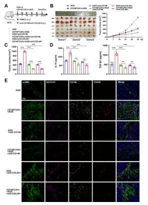 为了评估 CD146+CAFs 对肿瘤生长的影响以及在体内阻断 CD146 或 COL4A1 的治疗潜力,研究人员将分离出的 CD146+CAFs 与 AGS 细胞(比例为 1:1)皮下共注射到 NCG 小鼠体内,以建立 CDX 模型。随后,通过尾静脉向 NCG 小鼠输注来自健康供体的人类外周血单个核细胞(PBMCs),以重建小鼠的免疫功能,从而在该体内模型中研究人类免疫反应。研究人员将小鼠随机分组,分别接受腹腔注射抗 CD146 和抗 COL4A1。来自不同供体的 PBMCs 处理的三组肿瘤在肿瘤大小方面没有显著差异。