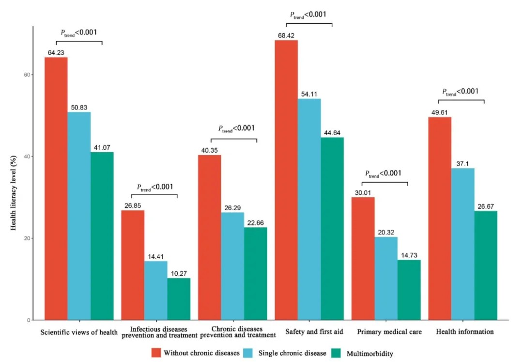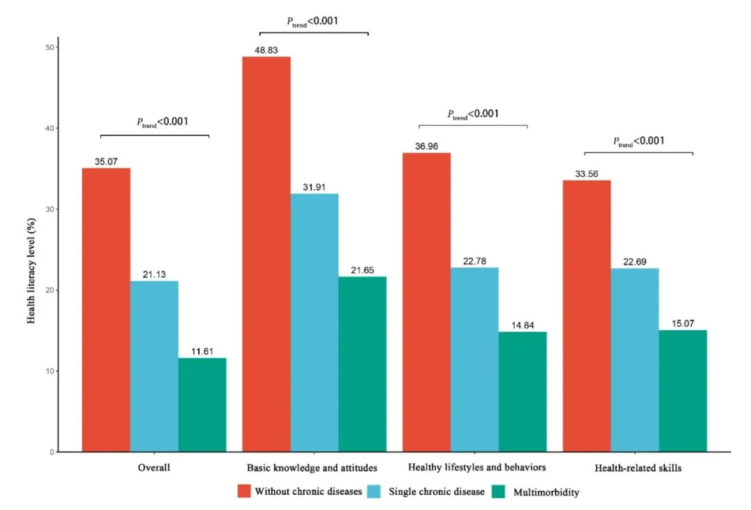 研究显示,安徽省15-69岁居民的健康素养达标率仅为31.90%,且随慢性病负担加重而显著下降:无慢性病人群达标率为35.07%,患单一慢性病者降至21.13%,而多病共存者仅11.61%。在调整居住地、年龄、教育水平等混杂因素后,多病共存者拥有达标健康素养的几率比无慢性病人群低24%。