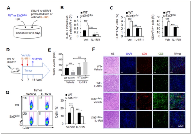 IL-1β-IL-1 受体(IL-1R)1 信号通路对于调节炎症中肠上皮细胞(IEC)的功能至关重要。IL-1β 上调了 IEC 中的 IL-1R1 表达以及 T 细胞中的 IFNγ 生成。此外,Sirt3∆Epi 导致小鼠结直肠癌中 CD4+T 细胞和 CD8+T 细胞中 IL-1R1 的表达增多。这些进一步表明 IL-1R1 信号可能参与了由 Sirt3∆Epi 肠上皮细胞诱导的 T 细胞功能的调节。为了验证 IL-1R1 信号在调节肠上皮细胞诱导的 T 细胞功能中的作用,研究人员在体外建立了肠上皮细胞与 T 细胞的共培养系统。从小鼠结肠固有层分离出 CD4+T 或 CD8+T 细胞,并按照先前描述的方法用或不用 IL-1R1 抑制剂进行预处理。从野生型和 Sirt3∆Epi 小鼠中分离出肠上皮细胞,并与 T 细胞共培养。尽管 Sirt3∆Epi 增强了 CD4+T 细胞和 CD8+T 细胞中 IFNγ 的生成,但 IL-1R1 抑制剂的处理几乎完全将这些变化恢复到了野生型对照水平。此外,研究人员在 MC38 结直肠原位肿瘤小鼠中也观察到了这些效应。尽管 Sirt3∆Epi 延缓了肿瘤生长并促进了 T 细胞功能以及向肿瘤的浸润,但用抑制剂阻断 IL-1R1 通常将这些变化逆转至对照水平。总之,这些数据表明 Sirt3∆Epi 通过 IL-1β-IL-1R1 信号通路延缓肿瘤生长并增强 T 细胞功能。