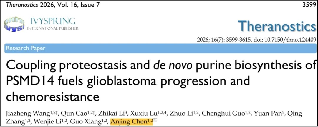 2026年1月1日出版的《Theranostics》杂志(中科院1区Top,IF=13.3)在线发表了山东大学齐鲁医院神经外科陈安静研究员团队的研究论文“Coupling proteostasis and de novo purine biosynthesis of PSMD14 fuels glioblastoma progression and chemoresistance”,系统揭示了去泛素化酶PSMD14以其不依赖于蛋白酶体的新功能驱动胶质母细胞瘤进展并增强替莫唑胺耐受。