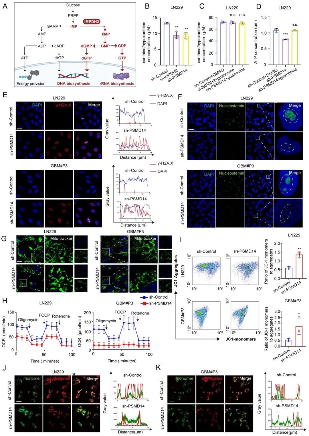 研究发现,PSMD14在GBM组织中表达显著升高,且与患者不良预后相关。机制上,PSMD14通过特异性去除嘌呤合成限速酶IMPDH2的K48链接泛素化修饰,维持其蛋白稳定性,保障细胞内GTP的持续供应,进而促进核苷酸从头合成与线粒体能量代谢,最终驱动肿瘤进展并诱导化疗耐药。PSMD14介导的这一调控轴在功能上实现了蛋白稳态与核苷酸代谢的耦联,靶向PSMD14有望实现对GBM生存依赖的双重打击。进一步,PSMD14抑制剂硫藤黄素能够干扰上述代谢通路,抑制肿瘤生长并延长生存期,与替莫唑胺TMZ协同发挥抗肿瘤效应,为同时靶向肿瘤的蛋白质稳态与核苷酸代谢提供了新策略。