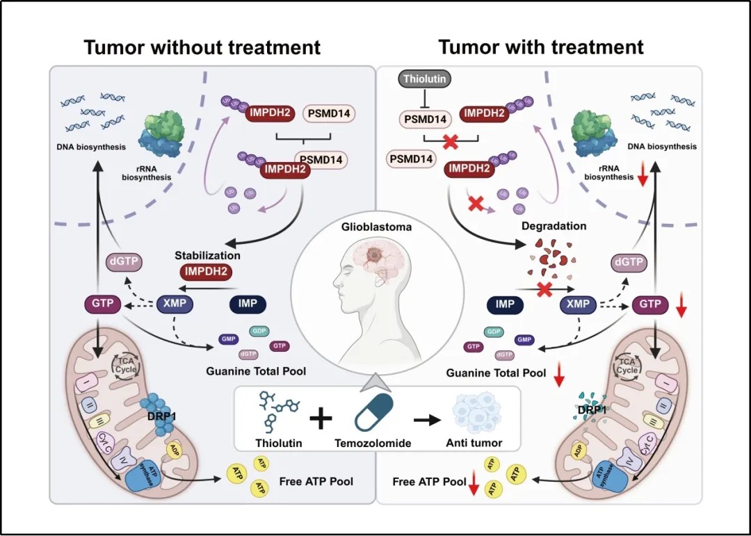 模式图揭示胶质母细胞瘤GBM中PSMD14稳定IMPDH2维持核苷酸代谢与线粒体质量,硫藤黄素靶向PSMD14与替莫唑胺呈协同抗肿瘤效应