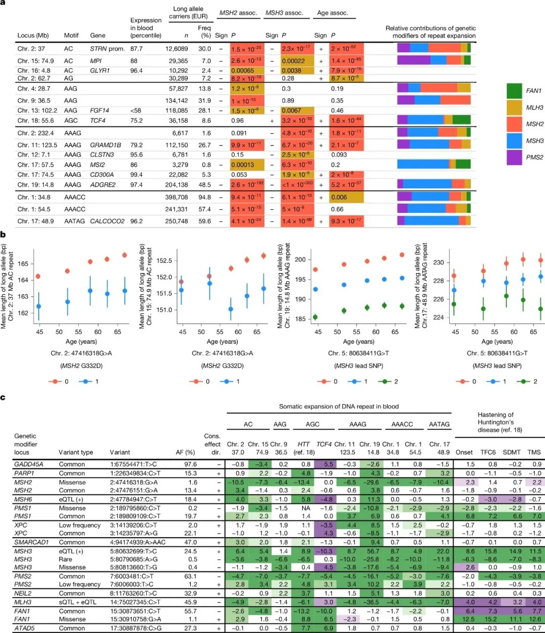 近日,一项发表于国际知名期刊《Nature》的大型研究通过对90万生物样本库参与者数据的分析,揭示了DNA重复序列在人类生命周期中的动态变化规律。研究首次系统性地量化了短串联重复序列(STRs)在体细胞与生殖细胞中的不稳定性,并发现其与多种疾病风险密切相关,为神经退行性疾病的机制研究与治疗策略提供了新视角。