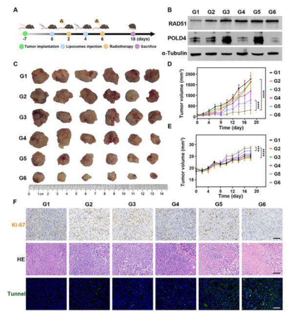 在本研究中,PIO@Lipo 在首次放疗前两天给药,以实现有效的 POLD4 敲低。随后研究人员分析肿瘤组织中 POLD4 和 RAD51 的表达水平。结果表明,与对照组相比,治疗组 G3 - G6 中 RAD51 的表达显著上调,其中 G5 - G6 组上调最为明显。研究表明用药对肿瘤生长有显著的抑制作用。此外,G6 组联合治疗的小鼠体重稳定增长,其体重明显高于 G5 组(p = 0.002)和其他组。这些结果表明,基因治疗与放疗联合应用有效缓解了小鼠因肿瘤导致的消瘦和营养不良。体内研究表明,靶向 POLD4 敲低协同增强了前列腺癌放疗的疗效。从机制上讲,这种治疗方法通过损害 DNA 损伤修复和激活程序性细胞死亡途径破坏了基因组稳定性。该干预措施不仅抑制了放疗耐药网络,还显著减缓了恶性进展。因此,本研究提供了证据表明 POLD4 是一种有效的放射增敏靶点,为放疗增强提供了新的治疗潜力。