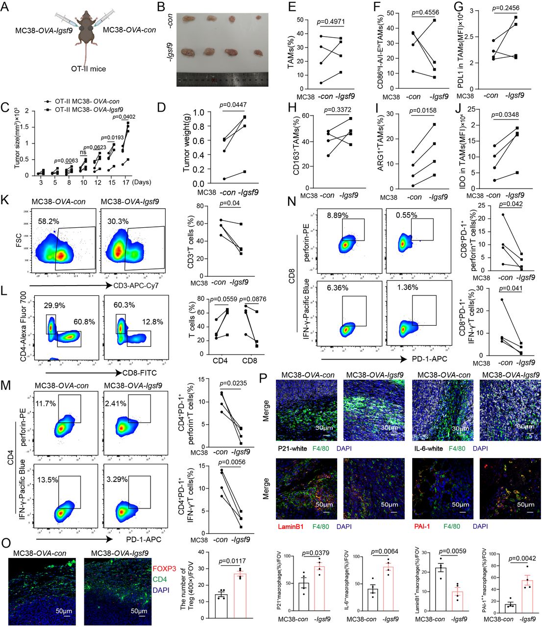 IGSF9 促进了 OT-II 小鼠体内携带 MC38-OVA/-con/-Igsf9 的巨噬细胞向衰老样表型极化