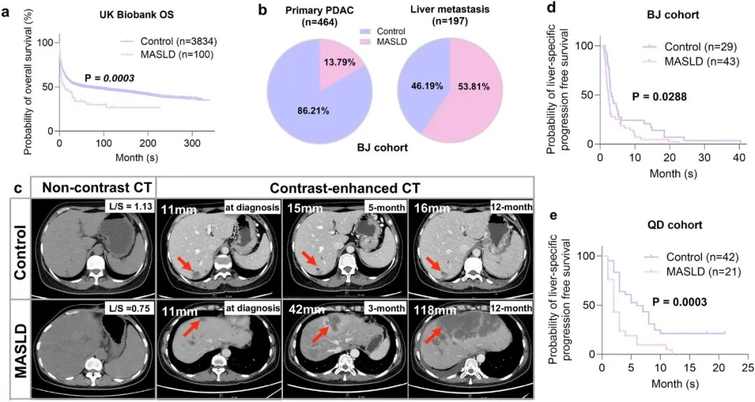 在中国多中心临床队列的进一步验证中,研究团队有了更关键的发现:合并MASLD的胰腺癌患者,其肝脏转移风险飙升7倍以上,且这些患者发病年龄更轻。这意味着,脂肪肝的存在,犹如为胰腺癌细胞向肝脏的“扩散”铺就了一条“高速公路”。
