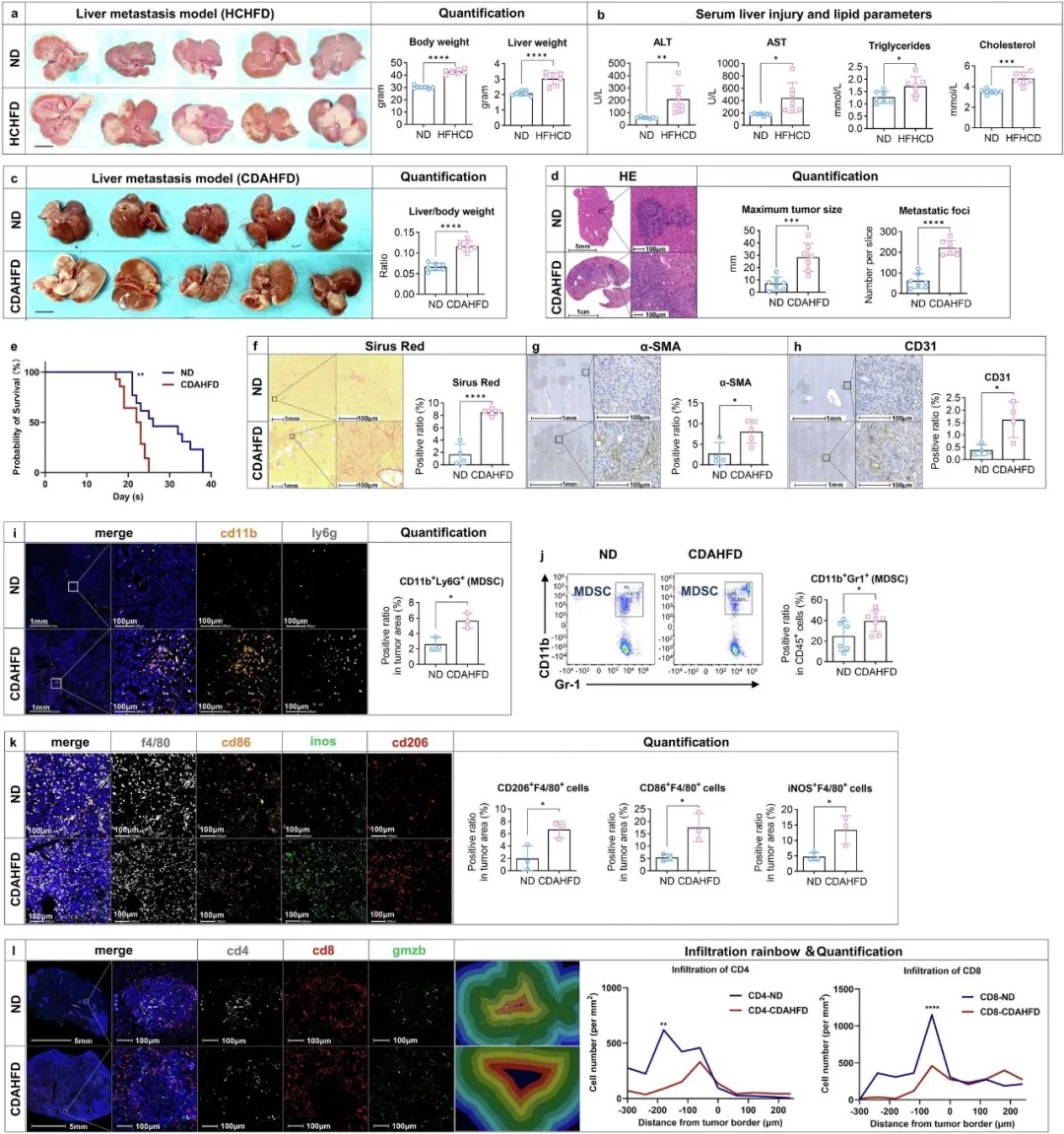 为了解开这一现象背后的谜团,研究人员利用多种饮食诱导的小鼠脂肪肝模型进行探究。结果一致表明,在脂肪肝环境下,胰腺癌的肝转移灶更大、更多,小鼠生存期显著缩短。