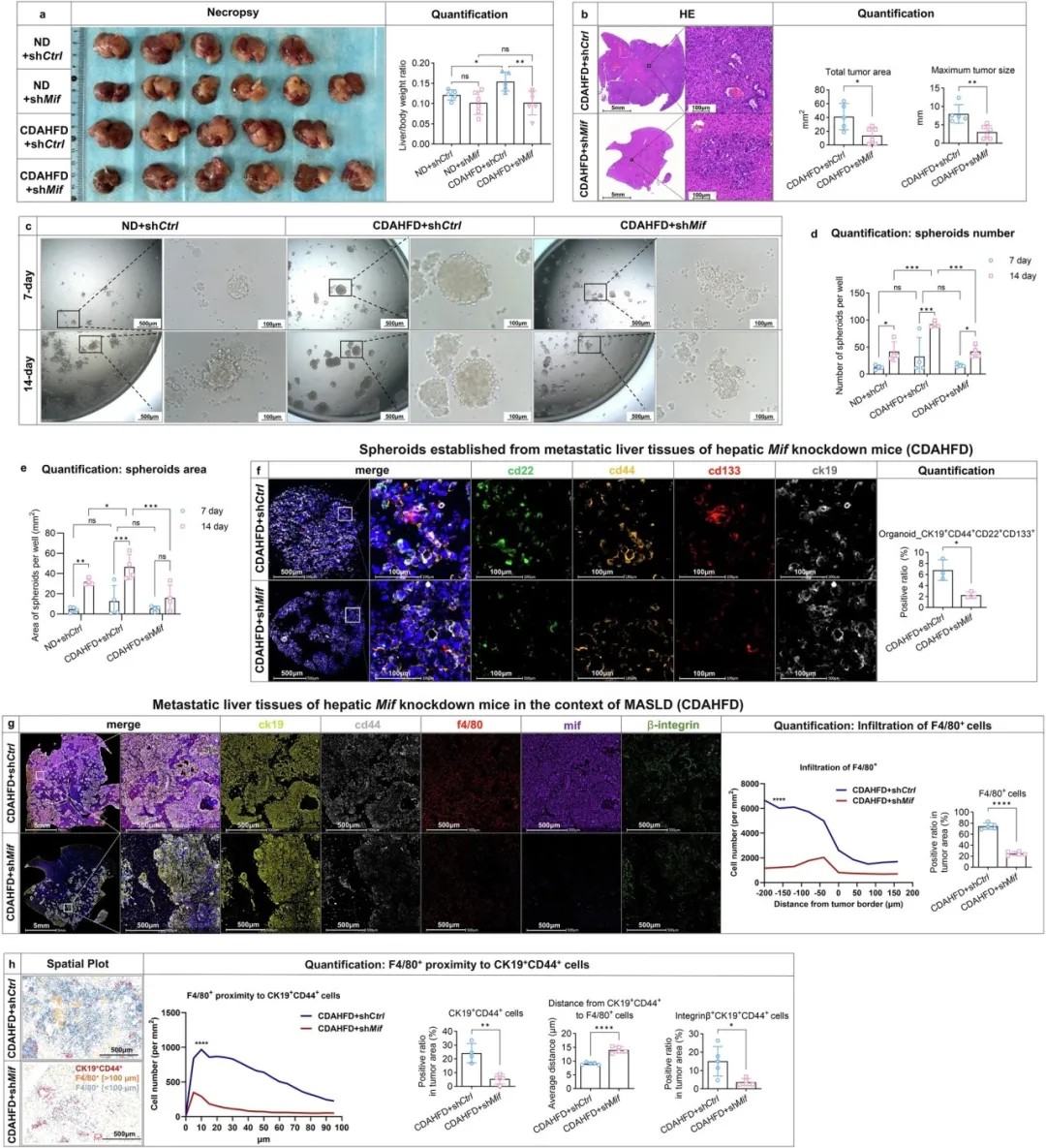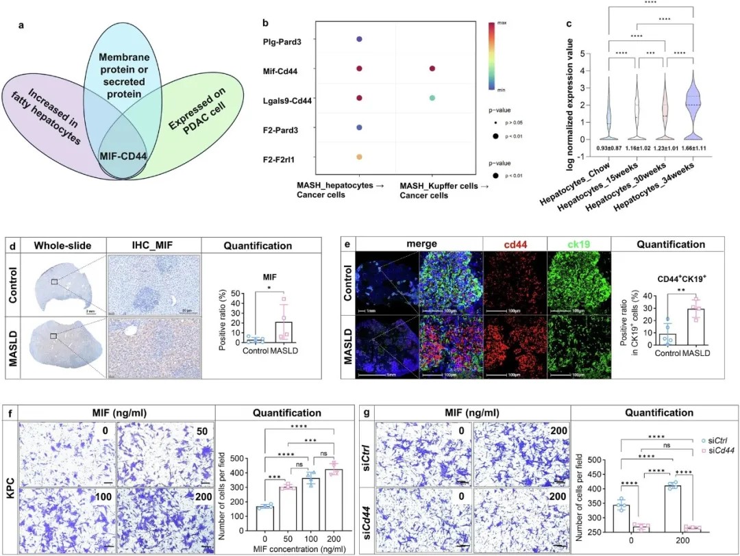 最后,研究团队在少数胰腺癌肝转移患者的组织样本中验证了这一机制的存在:与动物模型一致,合并MASLD的患者其非肿瘤肝组织MIF表达更高,转移瘤中CD44阳性的癌细胞也更多。