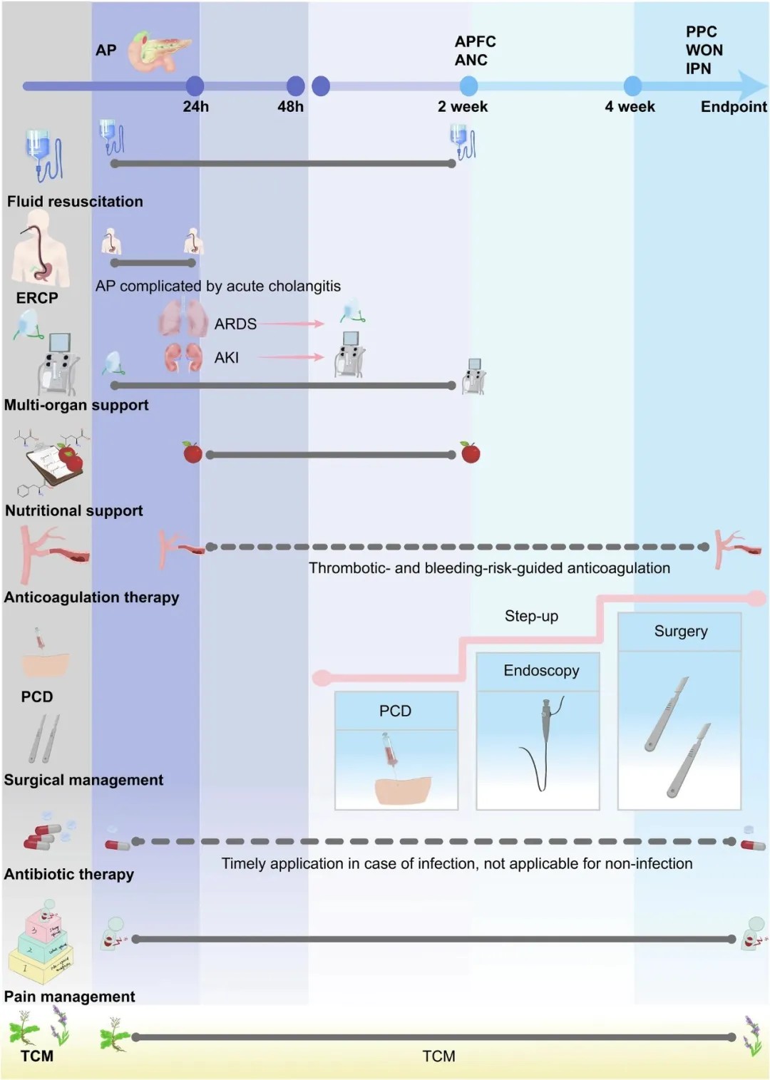 营养支持:肠内营养应于发病24-72小时内启动,可降低多器官衰竭风险;益生菌和ω-3脂肪酸有望调节肠道菌群,减轻全身炎症。