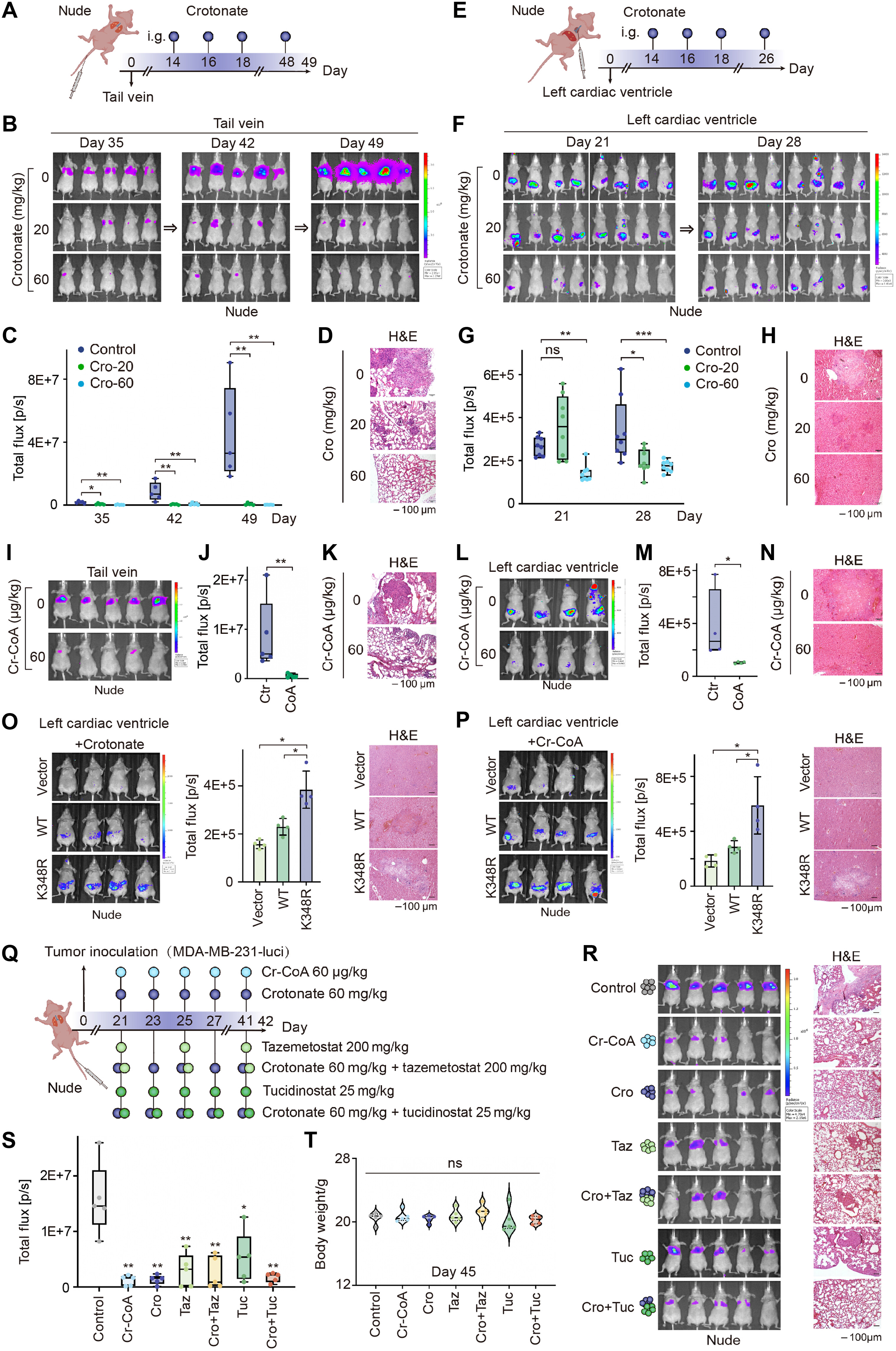 为了探究 EZH2 硬脂酰化是否在硬脂酸介导的转移调控中起关键作用,研究人员在动物实验中使用了稳定表达 EZH2-WT 或 K348R 的 MDA-MB-231-Luc-D3H2LN 细胞。将细胞经心内接种到小鼠体内 14 天后,给动物分别施用巴豆酸和巴豆酰辅酶A。结果表明,与表达 EZH2-K348R 的细胞相比,巴豆酸和巴豆酰辅酶A 均显著抑制了表达 EZH2-WT 细胞的肝转移。这些发现表明,EZH2-K348cr 在很大程度上介导了硬脂酸对癌细胞转移的抑制作用。