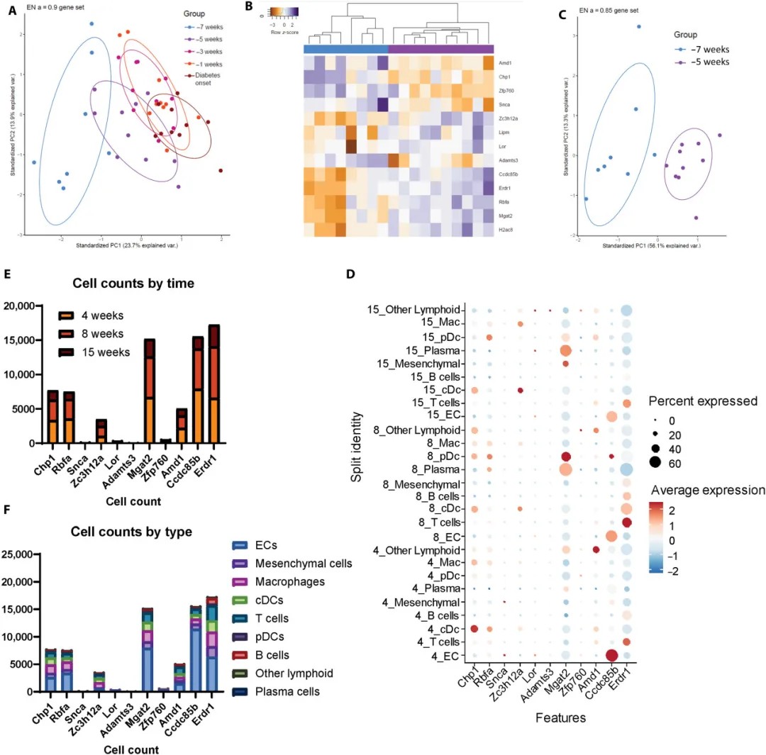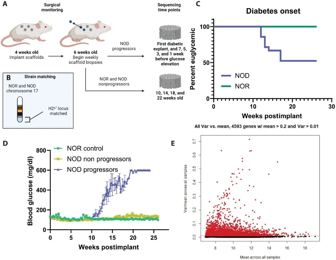 研究团队在非肥胖糖尿病(NOD)小鼠模型中植入可重复取样的IN支架,通过纵向RNA测序分析发现: