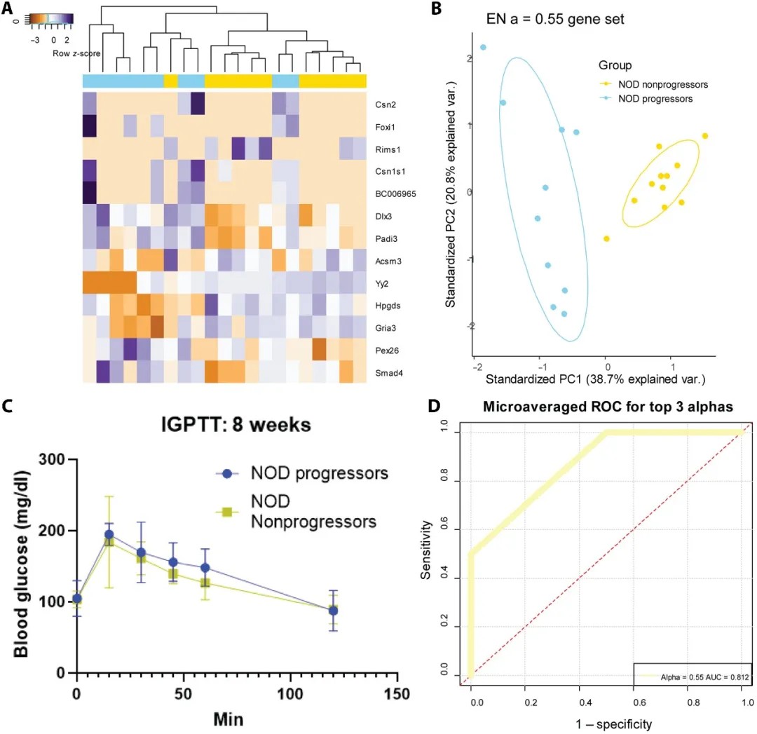 风险分层精准:仅需13个基因标志物即可在6周龄时区分进展型与非进展型小鼠,早于葡萄糖耐量试验异常出现时间;