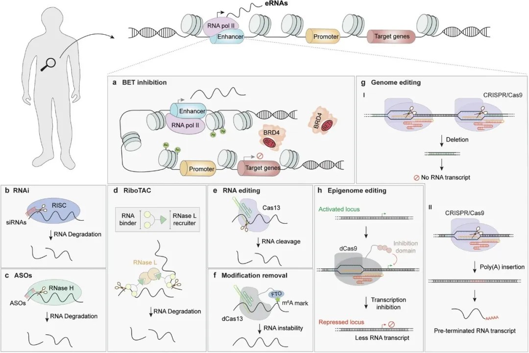 • 直接降解:通过反义寡核苷酸、CRISPR/Cas13系统或新型小分子降解剂特异性清除eRNA;