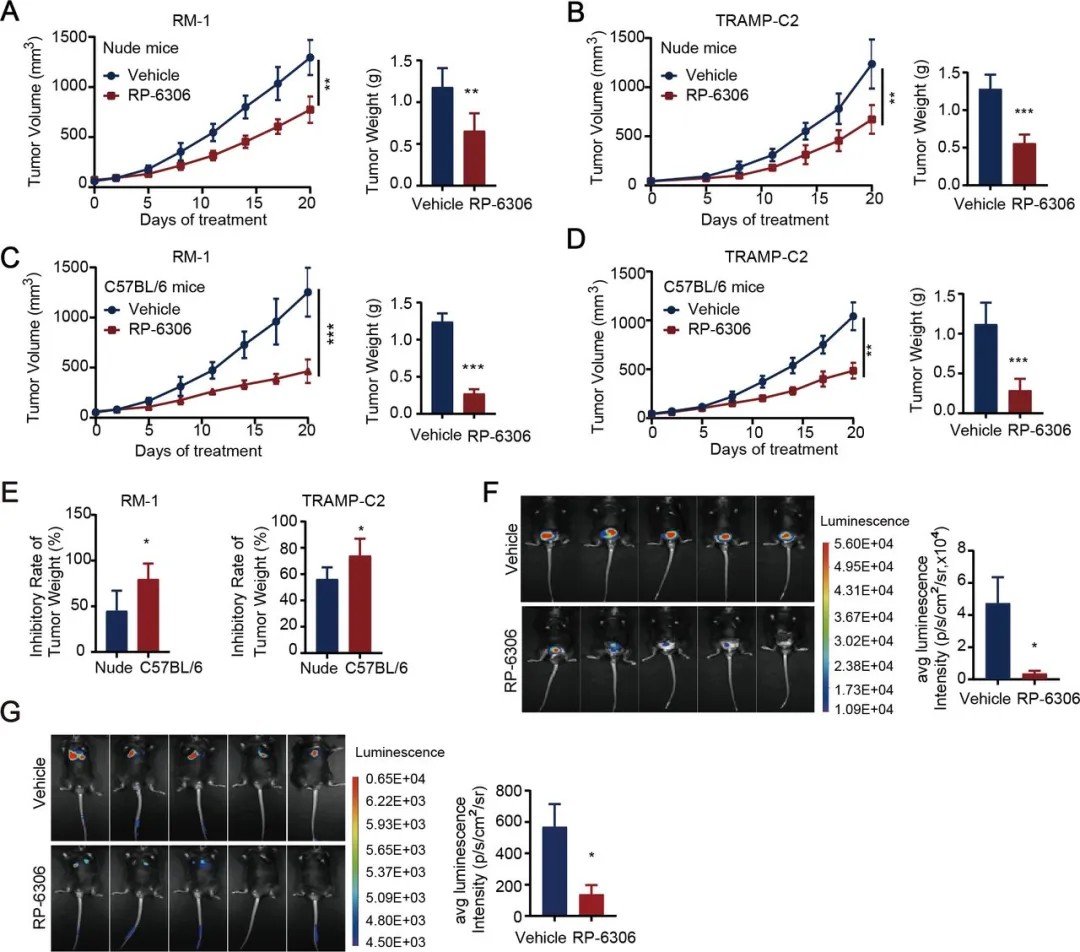 为了探究 PKMYT1 在前列腺癌(PCa)中的功能作用,研究人员在一组人源和鼠源的前列腺癌细胞中进行了基因敲低或药物抑制(RP-6306)实验。体外实验证实,抑制 PKMYT1 可降低细胞增殖和集落形成,同时促进细胞凋亡。与细胞自主的抗肿瘤效应一致,靶向 PKMYT1 显著抑制了免疫缺陷裸鼠移植 C4-2B 细胞瘤的生长。鉴于观察到 PKMYT1 表达与 IFN 信号通路呈负相关,研究人员接下来评估了免疫功能正常的 C57BL/6 小鼠的治疗效果。值得注意的是,在 RM-1 和 TRAMP-C2 模型中,RP-6306 在 C57BL/6 小鼠中的抗肿瘤效果明显优于裸鼠。数据表明免疫微环境对 PKMYT1 抑制的整体治疗反应有贡献。这一效应在原位植入和实验性转移模型中进一步得到证实,RP-6306 治疗显著抑制了原位肿瘤的生长,并抑制了肺转移。通过 shRNA 基因敲除 PKMYT1 同样延缓了 C57BL/6 小鼠的肿瘤进展。