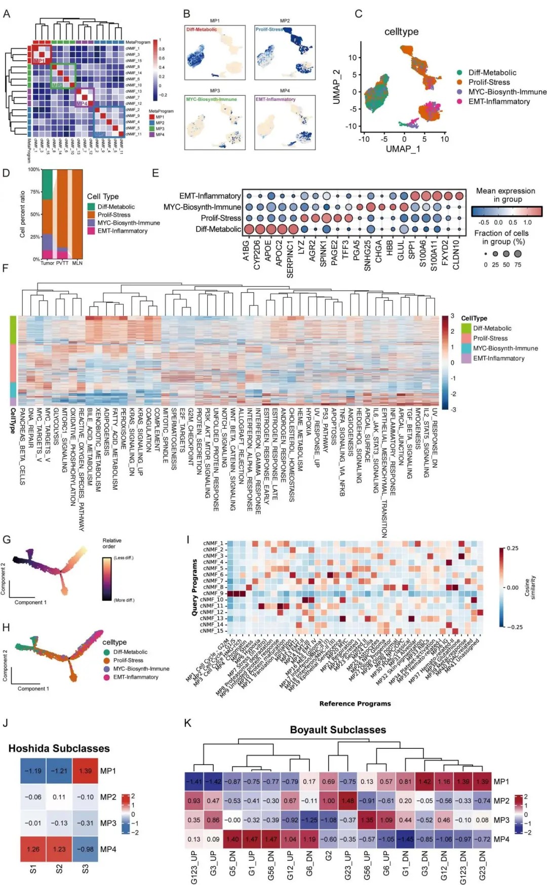 研究团队整合6个公共数据库的115例纯肝癌样本,涵盖正常肝组织、原发肿瘤、PVTT和转移淋巴结,通过单细胞测序技术识别出肝癌细胞存在四种核心“元程序”状态: