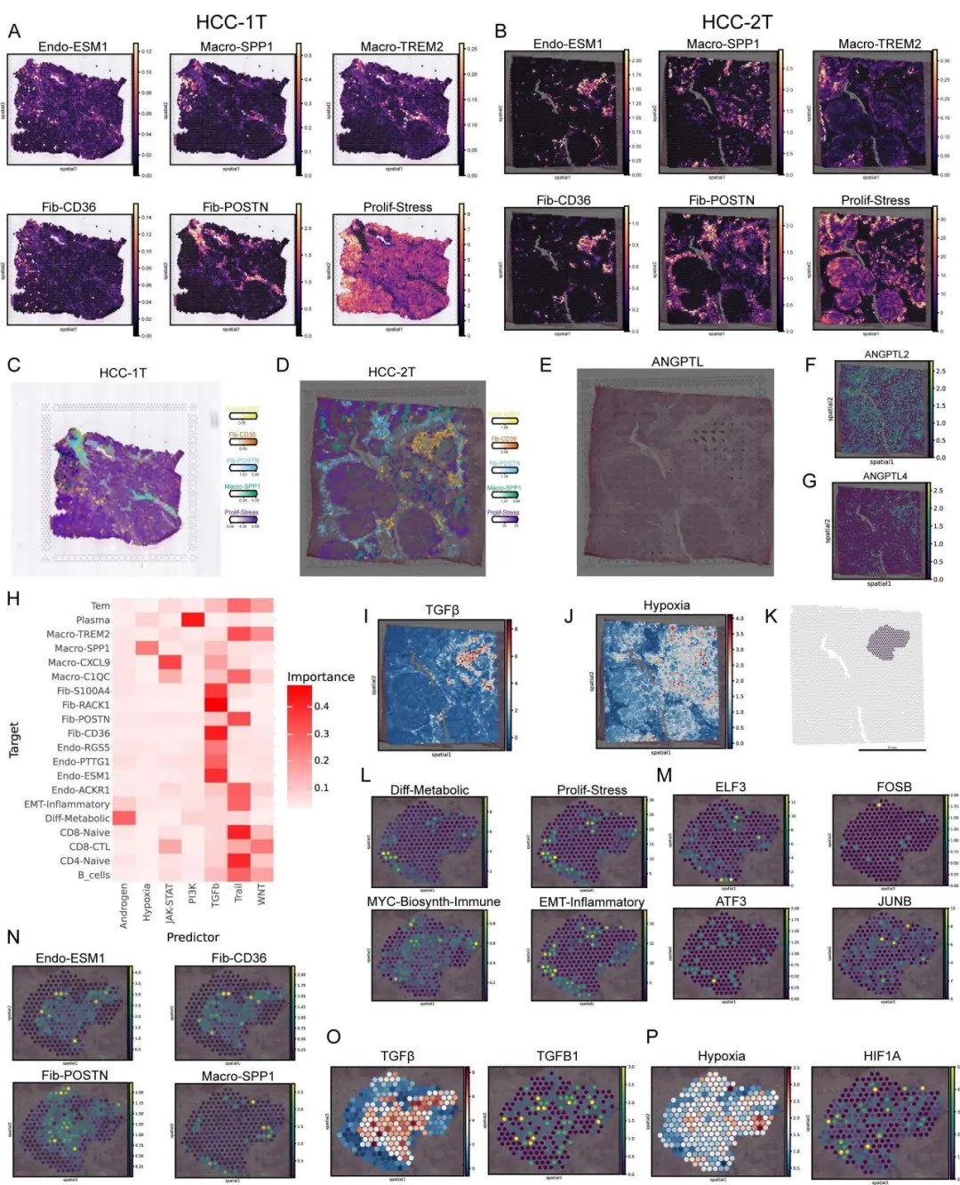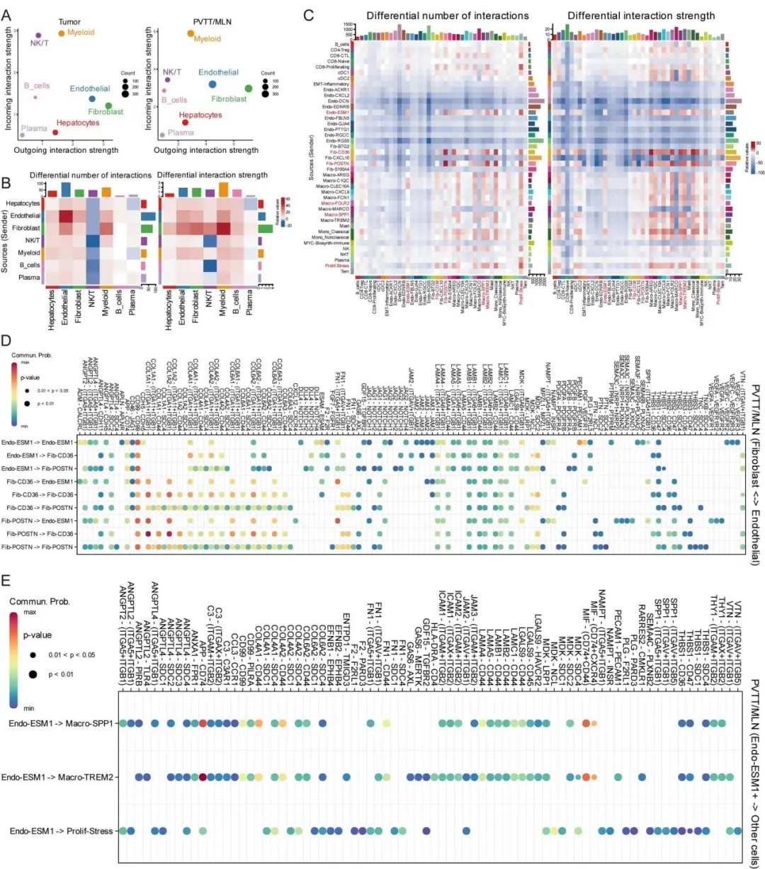 空间转录组分析首次揭示,内皮细胞亚群Endo-ESM1与成纤维细胞Fib-POSTN/Fib-CD36在肿瘤核心区形成TGFβ富集的生态位,通过ANGPT/ANGPTL4信号通路促进血管异常增生和细胞外基质重塑。该区域同时聚集了免疫抑制性巨噬细胞Macro-SPP1,共同构筑了支持肿瘤增殖与转移的微环境。