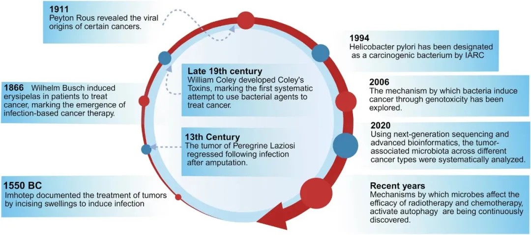 研究回顾了从公元前1550年古埃及医生通过感染法治疗肿瘤,到19世纪科利毒素的免疫疗法尝试,再到现代致癌微生物的发现。里程碑事件包括1983年幽门螺杆菌与胃癌的关联确认,以及近年肠道菌群对免疫检查点抑制剂疗效的调控机制。这些发现逐步颠覆了“肿瘤是无菌环境”的传统认知,证实微生物群通过炎症反应、基因毒性、免疫调节等途径直接参与癌症进程。