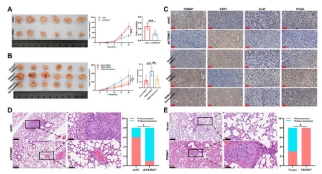 基于初步的细胞实验,研究人员在皮下异种移植小鼠模型中研究了 TRIM47 表达对肿瘤生长的影响。结果表明,与 HCCLM3 shNC 组相比,HCCLM3 shTRIM47 组的肿瘤体积和大小显著减小。相反,与 HepG2 载体组相比,HepG2 TRIM47 组的肿瘤体积和大小显著增大,但在硼替佐米治疗后显著减小。随后,研究人员对肿瘤组织中的 TRIM47、FBP1、KI-67、增殖细胞核抗原(PCNA)和 c-Myc 进行了免疫组化(IHC)分析。一方面,IHC 结果证实了 TRIM47 敲低和过表达在促进肿瘤形成方面的有效性。FBP1 表达的改变表明其在体内受 TRIM47 调控。KI-67 和 PCNA 的 IHC 结果表明,TRIM47 敲低在体内抑制肿瘤细胞增殖,而 TRIM47 过表达则促进增殖。最后,c-Myc 的 IHC 结果表明,TRIM47 可以影响皮下异种移植小鼠模型中肿瘤细胞的糖酵解能力。此外,研究人员通过肺转移模型评估了 TRIM47 对肿瘤转移的影响,结果表明 HCCLM3 shTRIM47 组的肺转移灶数量显著少于 HCCLM3 shNC 组。