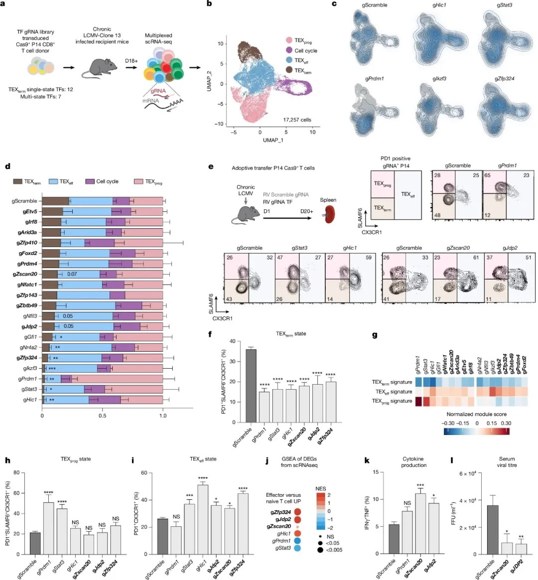 研究人员设计了一个包含19个转录因子的向导RNA文库,在慢性淋巴细胞性脉络丛脑膜炎病毒感染模型中进行了筛选。结果显示,敲除大多数TEXterm相关转录因子显著减少了终末耗竭T细胞的分化。