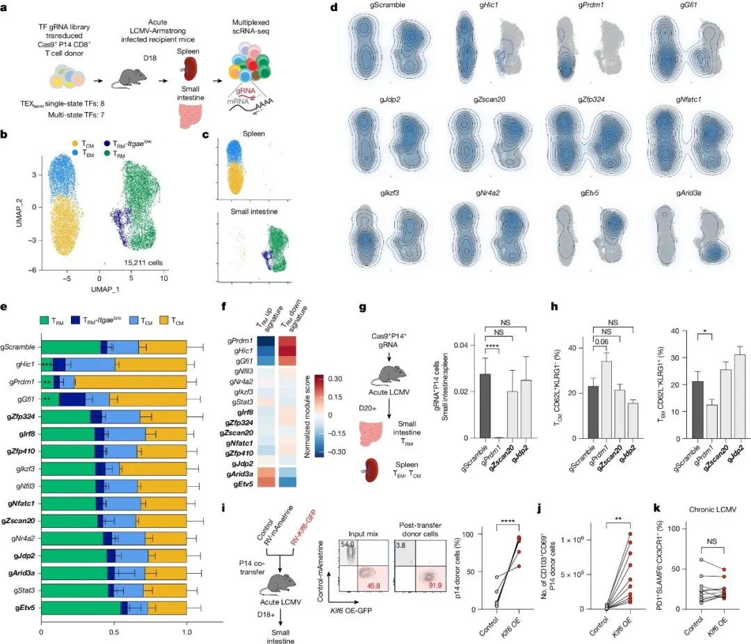 此外,研究还发现KLF6是TRM细胞的特异性转录因子。过表达KLF6可在急性病毒感染中显著增强TRM细胞形成,而在慢性感染中不会加剧终末耗竭。