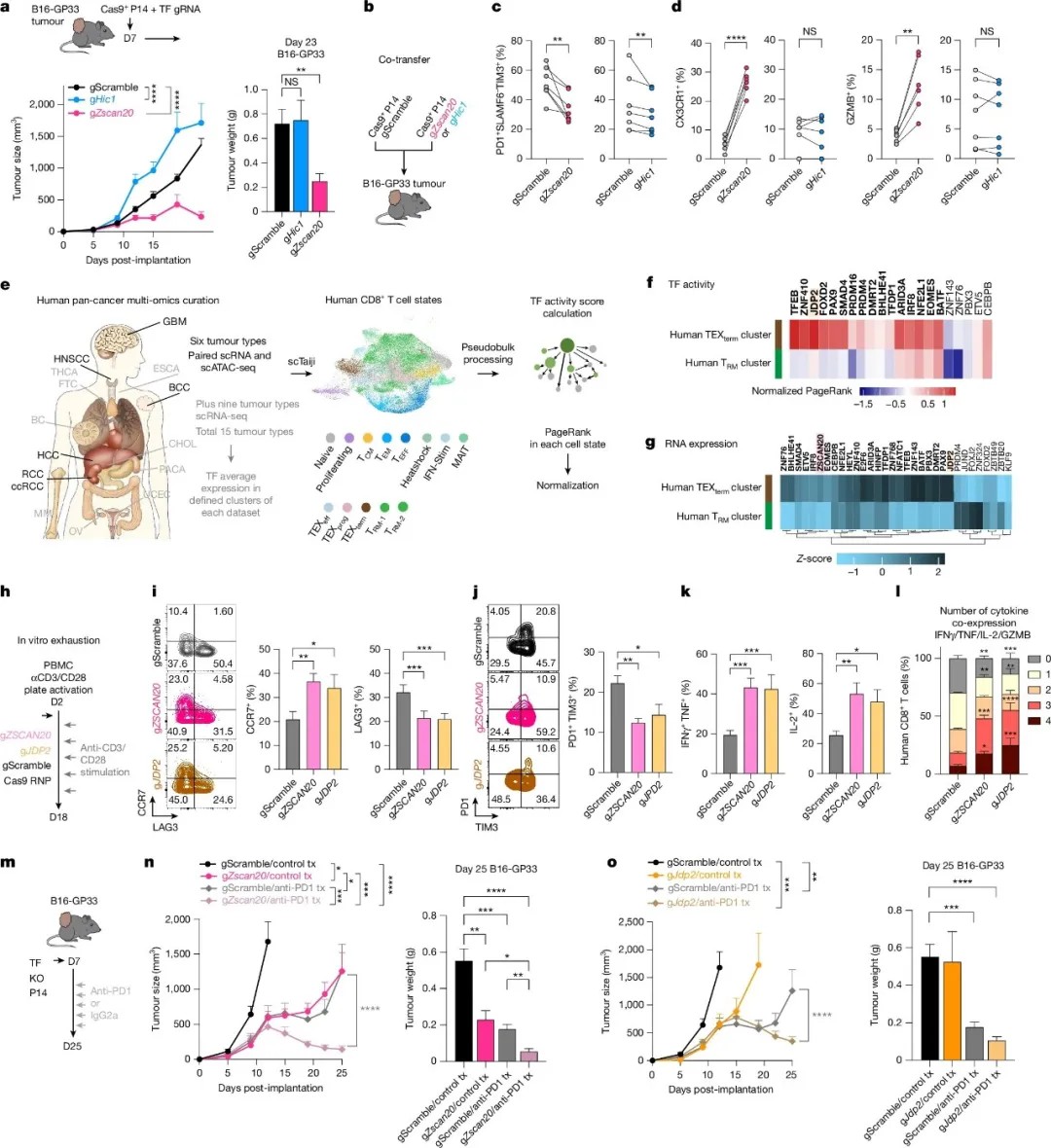 在人类原代T细胞中敲除ZSCAN20或JDP2,能够显著降低抑制性受体表达,同时提高效应细胞因子产生。这表明这些转录因子在人类T细胞中同样扮演着重要角色。