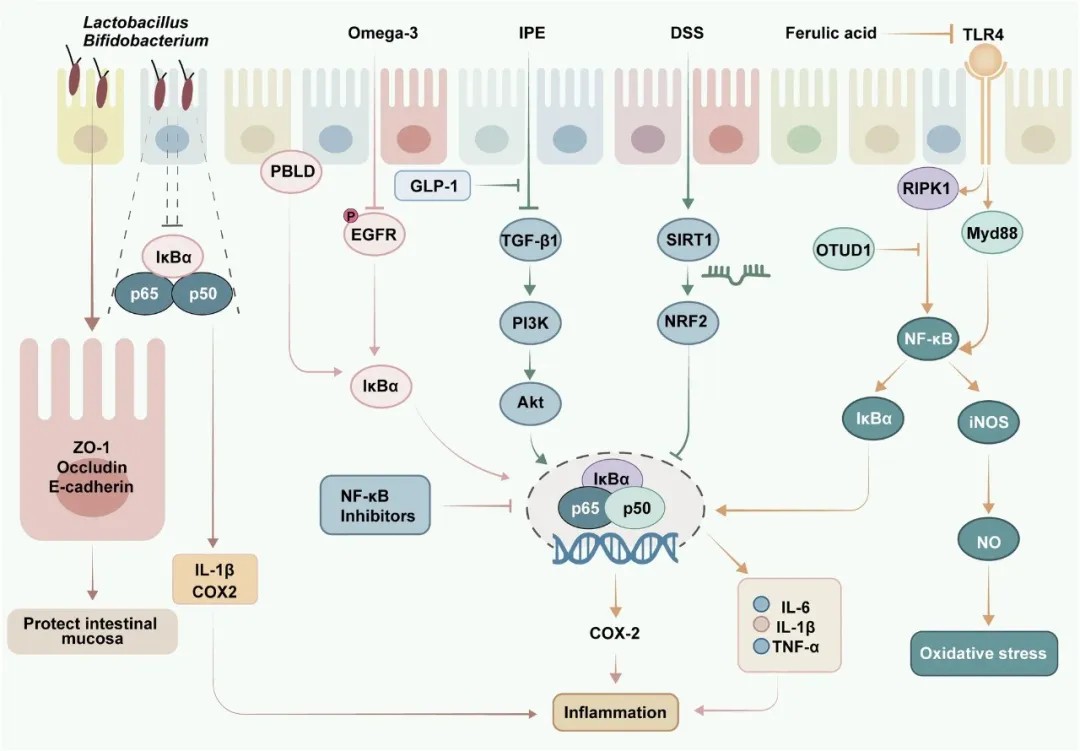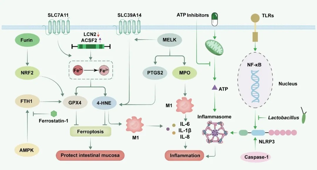 文章指出,自噬、内质网应激、线粒体功能障碍、巨噬细胞极化、铁死亡等细胞过程在溃疡性结肠炎发生发展中起关键作用。其中,铁死亡作为一种铁依赖性的程序性细胞死亡方式,通过调控GPX4等关键蛋白表达,可能成为抑制肠上皮细胞损伤的新靶点。此外,炎症小体(如NLRP3)的激活会促进IL-1β等炎性因子释放,其抑制剂可显著缓解肠道炎症。
