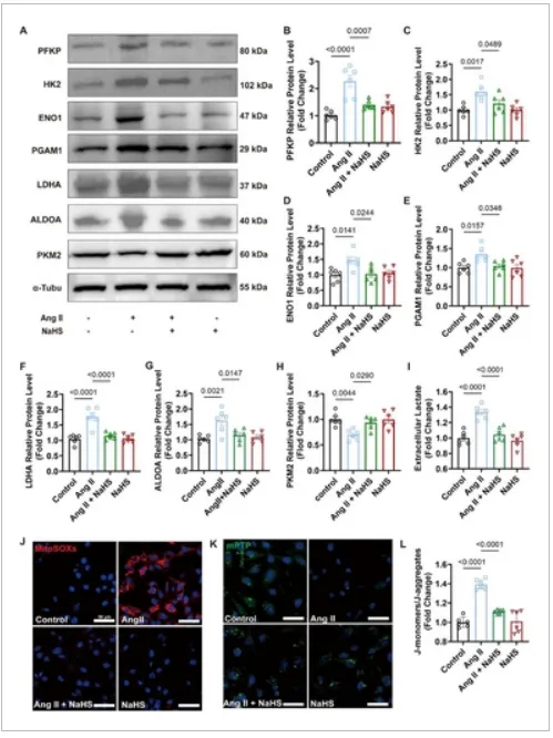 由于血管紧张素 II 组中糖酵解途径中大多数酶的表达上调,研究人员推测在这些条件下血管平滑肌细胞中可能会出现乳酸堆积。为了验证这一推测,研究人员接下来检测了细胞外和细胞内的乳酸含量。血管紧张素 II 处理后乳酸水平升高,但加入硫氢化钠后这种升高得到缓解。鉴于葡萄糖代谢的改变已知会损害线粒体功能,从而驱动多种疾病的发病机制。因此,研究人员接下来通过进行线粒体膜电位(JC-1)测定来探究线粒体功能。结果表明,血管紧张素 II 组中正常极化的线粒体减少,异常去极化的线粒体增加,而硫氢化钠共孵育则减轻了这种膜电位的下降。