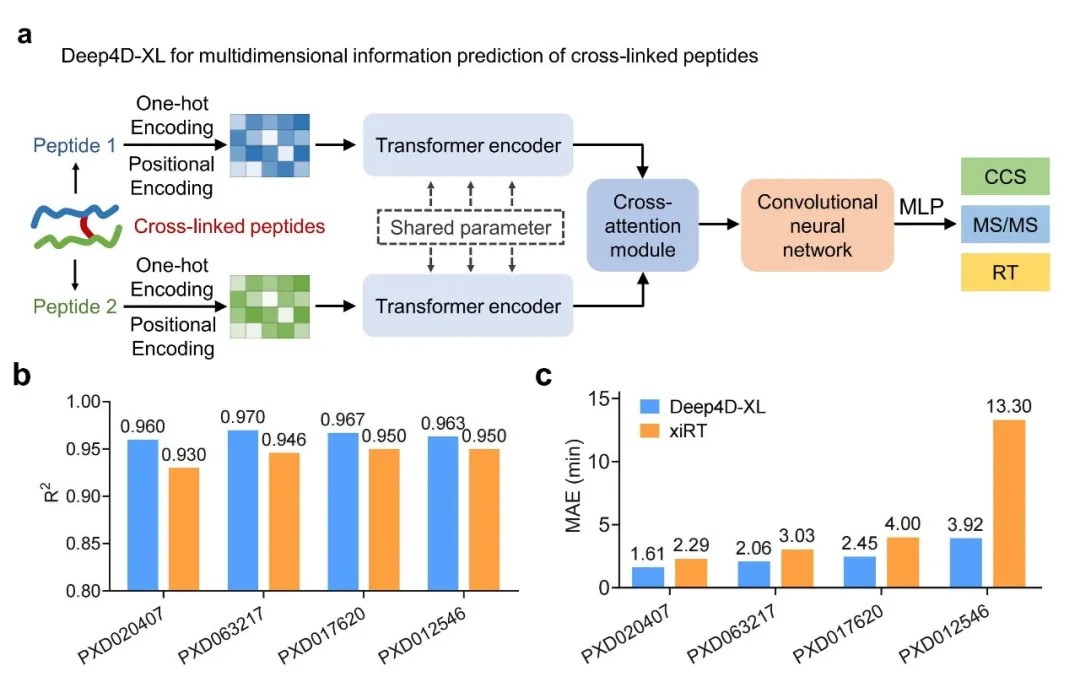 研究团队开发的XL-MSDigger平台,其核心为深度学习模型Deep4D-XL。该模型首次实现了对交联肽的多维信息精准预测,包括保留时间(RT)、碰撞截面(CCS)和碎片离子强度。实验表明,Deep4D-XL的预测精度显著优于现有工具(如xiRT),在多个独立数据集上均表现出更高稳定性和准确性。