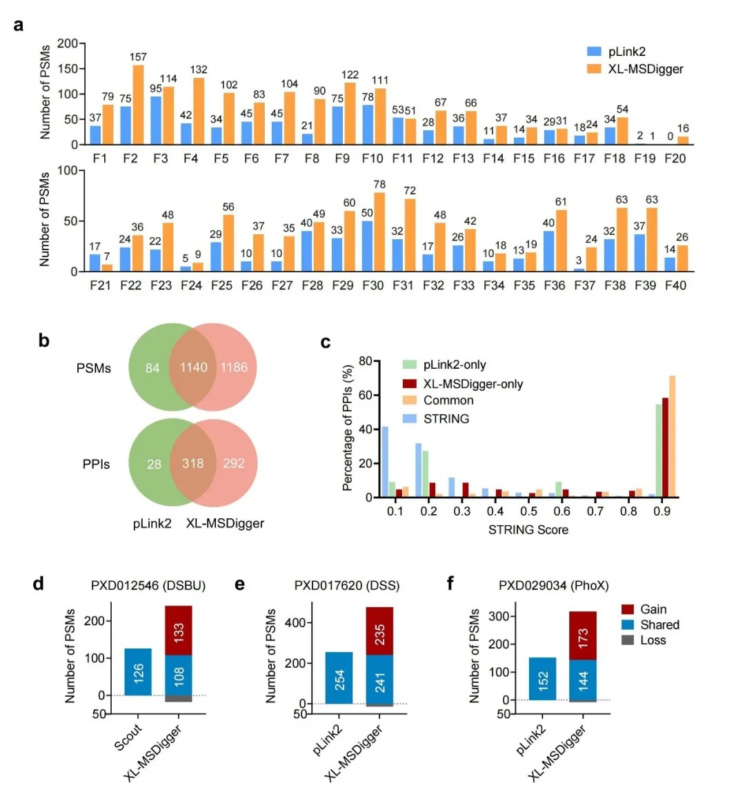 XL-MSDigger通过深度学习重评分算法,对数据依赖性采集(DDA)的XL-MS数据进行了优化。在40个HeLa细胞交联蛋白质组样本中,平台将蛋白质间交联肽的识别数量提升了106.9%,相关蛋白相互作用(PPIs)数量增加76.3%,且结果可靠性更高。