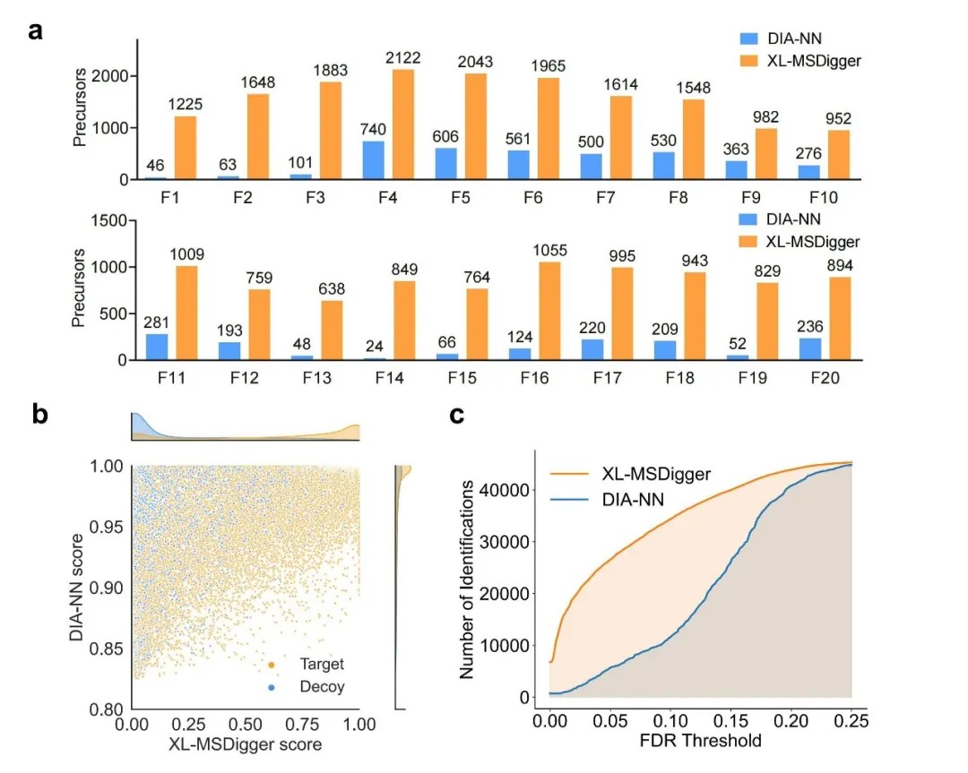 针对数据非依赖性采集(DIA)技术,平台首次构建了交联肽的诱饵谱库,并结合神经网络重评分算法,解决了DIA-XL-MS中假发现率(FDR)评估缺失的难题。在20个DIA数据集中,目标交联前体离子识别数量提升约5倍,且目标与诱饵肽的评分分布分离度显著改善。