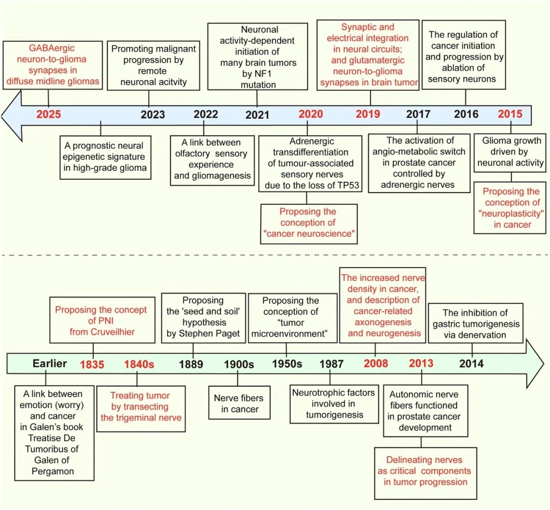 癌症神经科学的代表性发现与历史里程碑时间线对照图