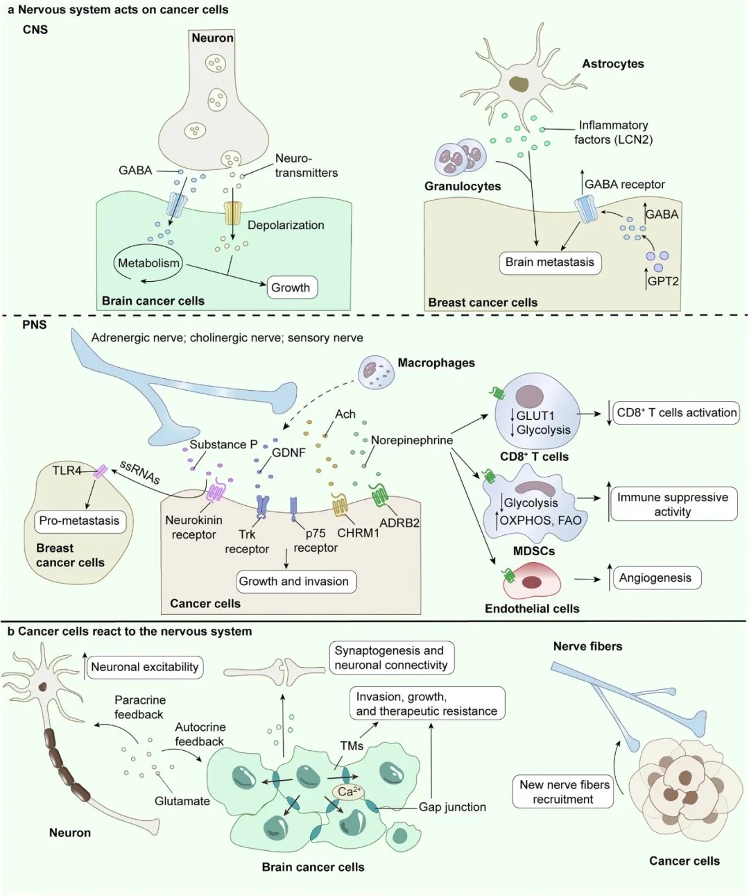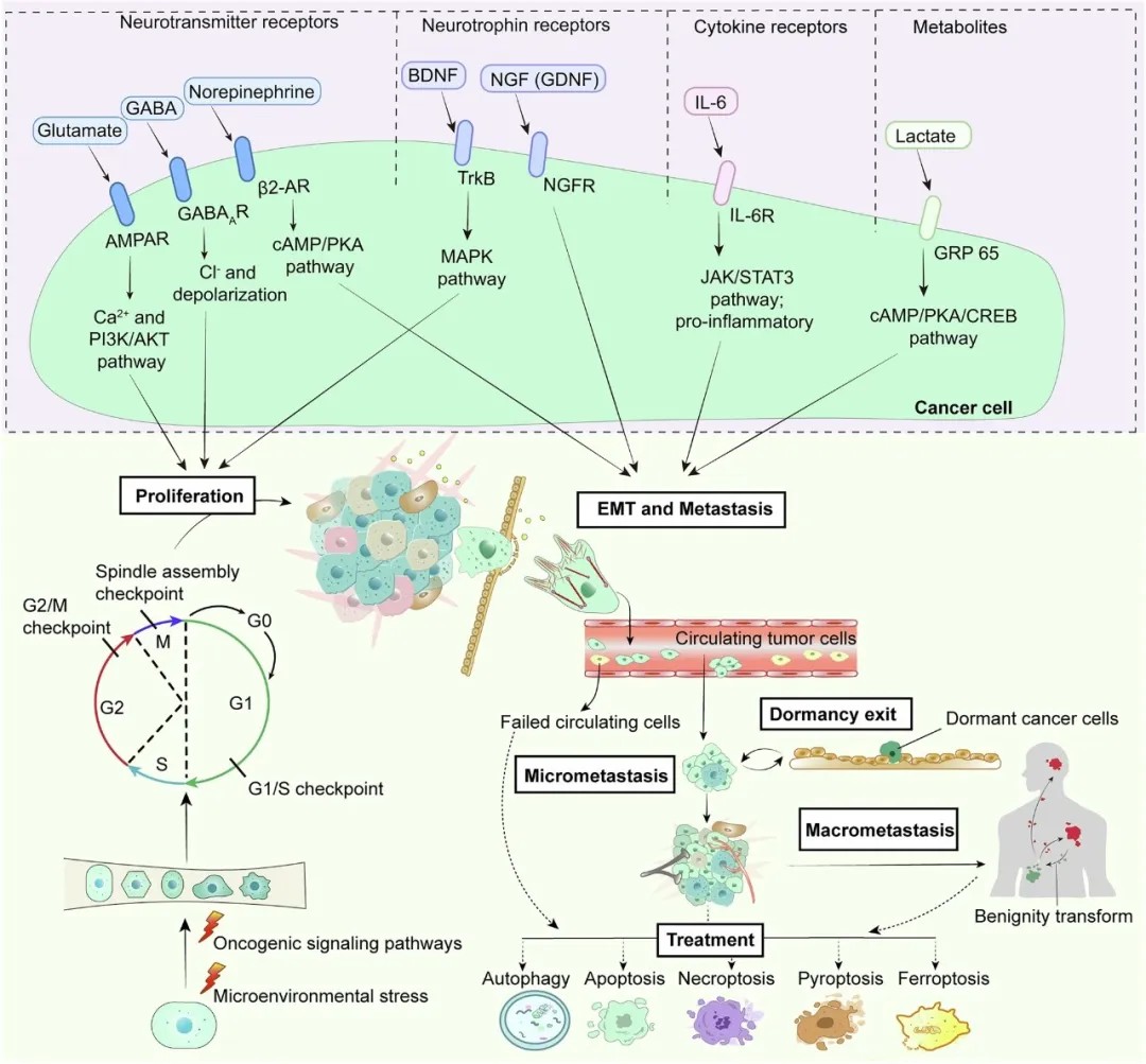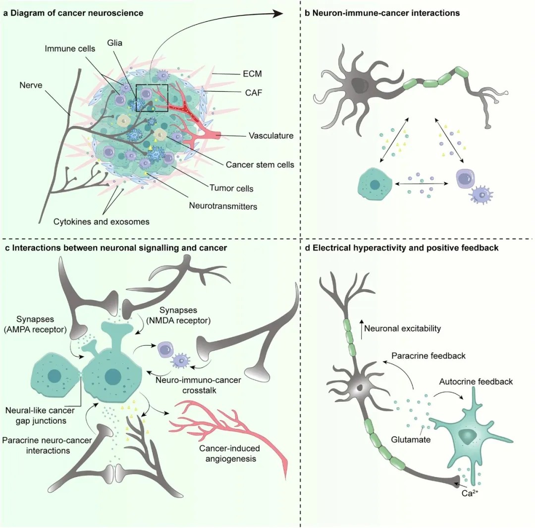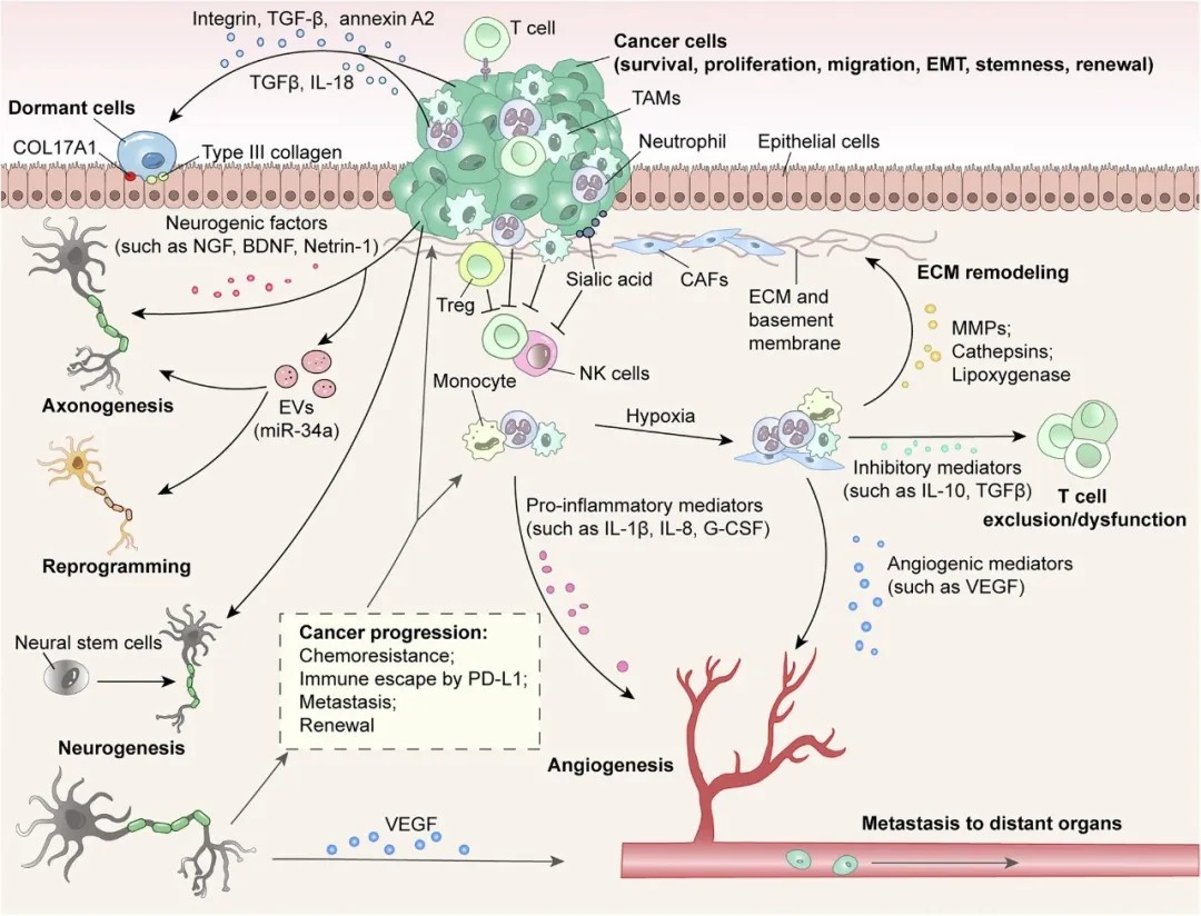 文章强调,神经系统对癌症的影响很大程度上通过调节免疫系统实现,形成一个复杂的“神经-免疫-肿瘤”微环境。