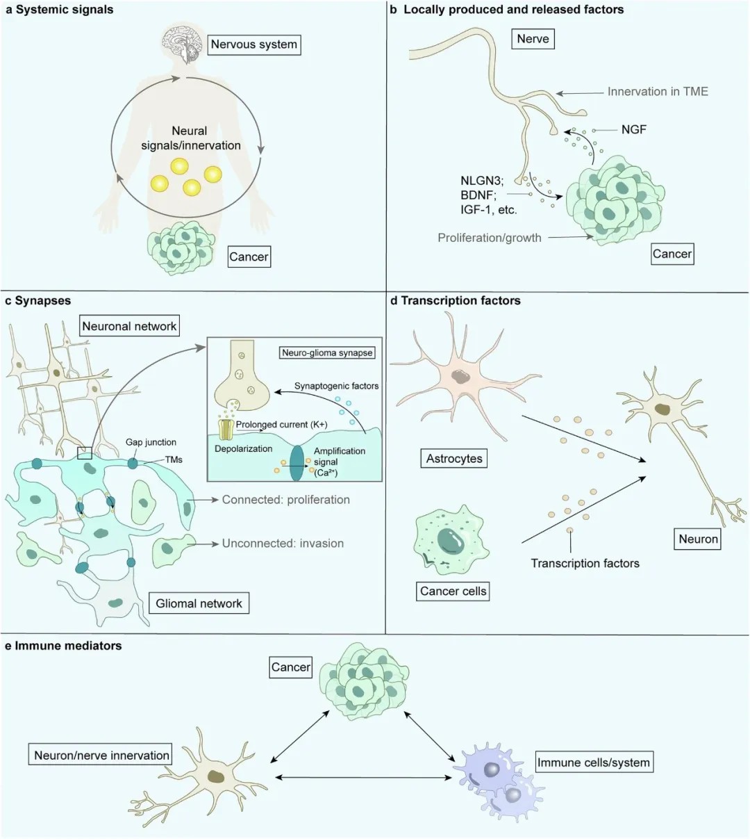 除了直接的突触连接,神经系统还通过分泌一系列“化学信使”远程遥控癌症进程: