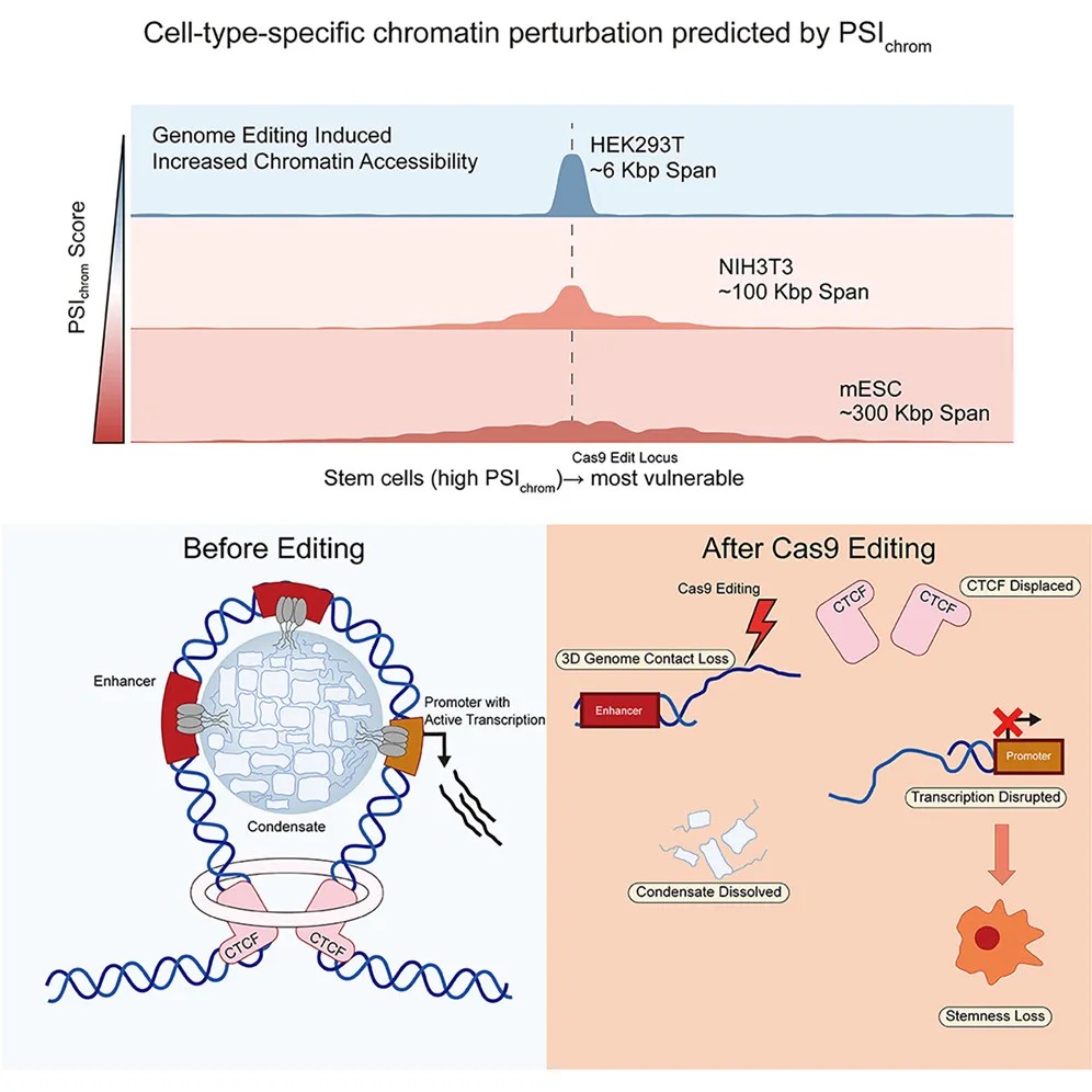 近日,清华大学李寅青/张学工/朱明团队一项发表于国际知名期刊《Cell Stem Cell》的研究揭示了CRISPR-Cas9基因编辑技术一个此前被忽视的重大副作用:即便在远离基因调控元件的非编码区进行编辑,也可能广泛扰动染色质三维结构,导致干细胞身份丢失。这项研究不仅阐明了其分子机制,更为重要的是提出了三种可最小化此类干扰、保全细胞功能的新型编辑策略,为基因编辑迈向更安全、更广泛的临床应用扫除了一大障碍。