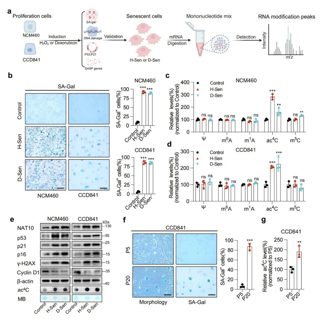 研究团队从“表观转录组学”这一前沿领域入手,重点关注了发生在mRNA上的化学修饰。研究发现,在衰老的人结肠上皮细胞中,ac4C这种修饰水平显著升高,而负责催化该修饰的关键酶NAT10的表达也同步上调。通过基因敲低、过表达等一系列细胞实验,团队证实NAT10正是通过其酶活中心催化的ac4C修饰,来调控结肠上皮细胞的衰老进程。抑制NAT10功能,可有效缓解细胞衰老相关表型,恢复细胞增殖能力。