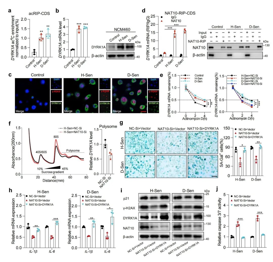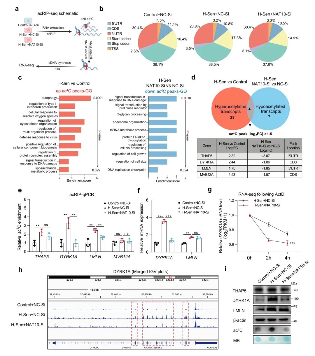 研究进一步深入,利用ac4C修饰转录组测序(acRIP-seq)技术,在全基因组范围内寻找受NAT10介导的ac4C修饰调控的关键下游基因。经过层层筛选与验证,团队最终锁定了一个名为DYRK1A的激酶基因。机制研究表明,NAT10能够与DYRK1A mRNA结合,并通过在其编码区沉积ac4C修饰,显著增强该mRNA的稳定性和翻译效率,从而导致DYRK1A蛋白水平异常升高。而过量的DYRKK1A则会驱动细胞衰老程序。