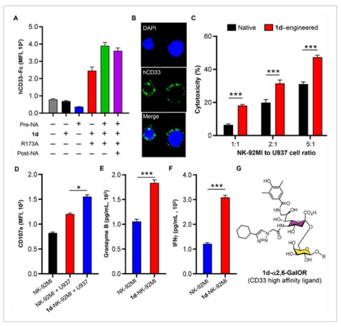 研究人员通过 NmCSS R173A 在原位激活了 1d,然后一步转移到带有 Pd2,6ST 的 NK-92MI 细胞中。流式细胞术和共聚焦成像显示 1d 成功安装,结合信号在约 400 微摩尔时达到饱和。与化合物 1b 的工程情况类似,用 SpNanA 预处理促进了 1d 的整合,并增强了 hCD33-Fc 的结合。相反,后处理未能加工已安装的 1d,表明这种双取代的 Neu5Ac 类似物不是 SpNanA 的理想底物。在细胞毒性试验中,1d 工程化的 NK-92MI 细胞在不同的 E/T 比率下对 U937 AML 细胞的杀伤作用显著增强,预去唾液酸化的细胞表现出最强的效果。刺激还导致 CD107a 表达增加以及穿孔素 B 和 IFNγ 分泌水平升高。