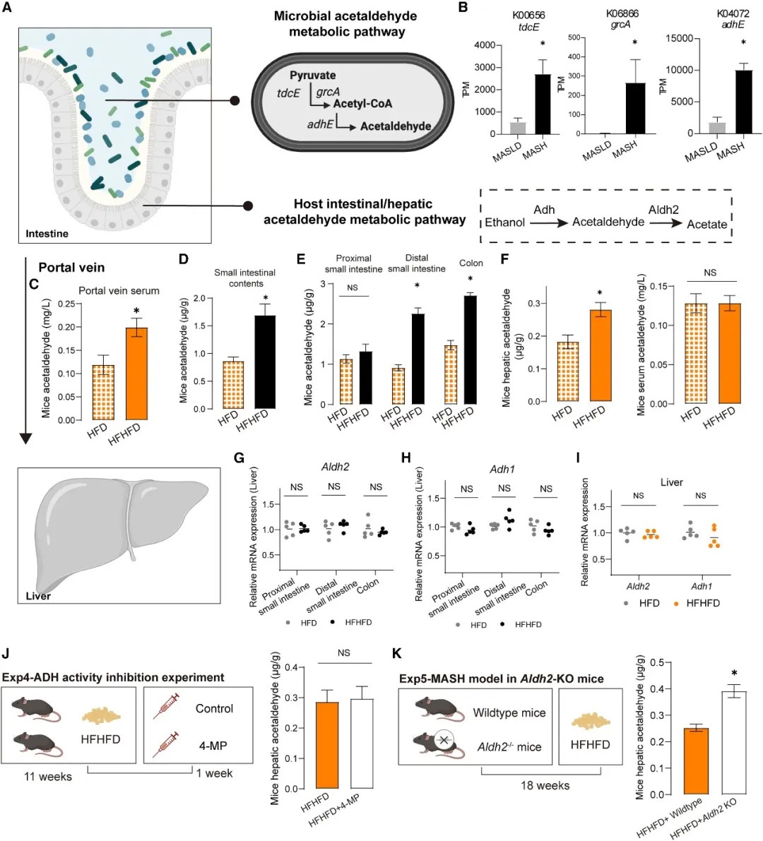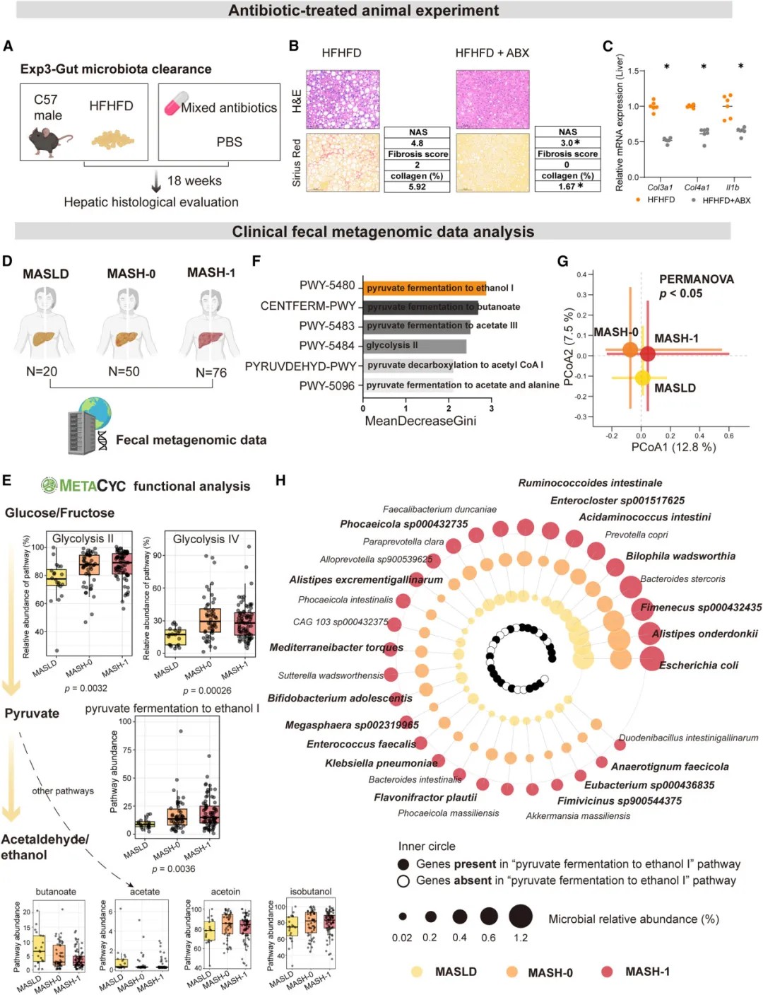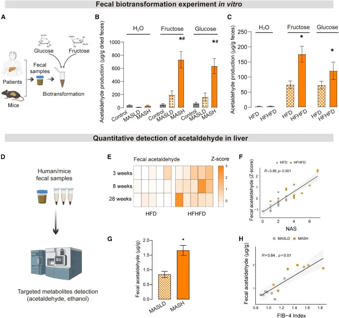 机制研究表明,肠道微生物在此过程中扮演了核心角色。通过对患者队列的宏基因组分析,科学家发现,当疾病进展至脂肪性肝炎阶段时,患者肠道菌群的功能发生显著重塑,倾向于通过“丙酮酸发酵生成乙醇I”等途径大量产生乙醛和乙醇。体外粪便转化实验进一步证实,来自肝炎患者的粪便样本利用果糖或葡萄糖产生乙醛的能力显著增强。