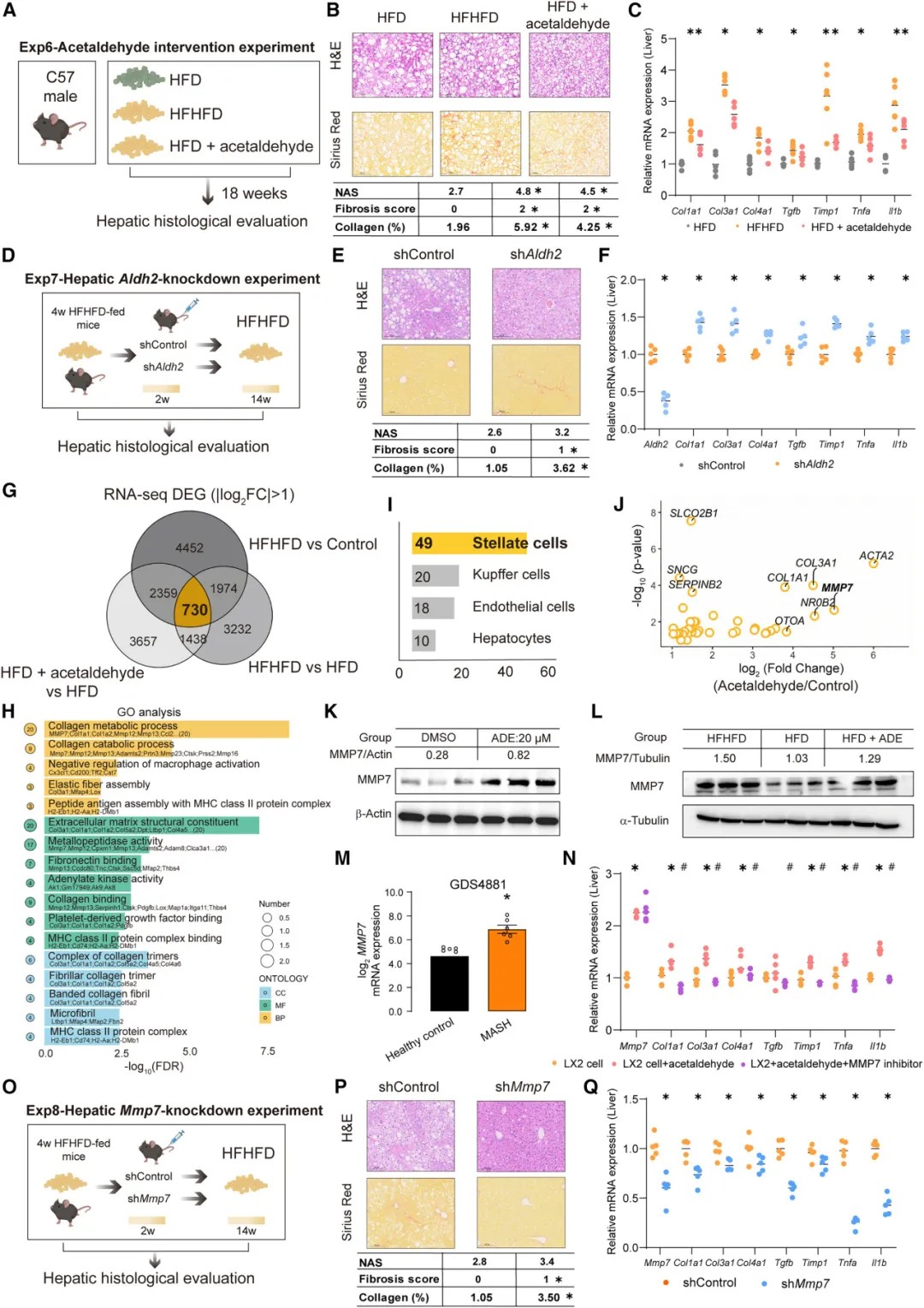 这些由肠道菌群产生的乙醛能够进入血液循环并到达肝脏。研究揭示,乙醛会激活肝星状细胞,通过上调基质金属蛋白酶7的表达,直接驱动肝脏纤维化的发生。在动物模型中,补充低剂量乙醛或特异性敲低肝脏清除乙醛的关键酶,均会加剧肝纤维化;而抑制MMP7则可有效缓解纤维化。