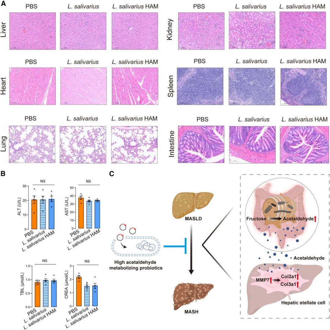 基于上述机制,研究团队从长期饮酒但肝脏健康者的粪便中,筛选出一株具有较强乙醛降解能力的唾液乳杆菌。通过基因工程手段使其过表达微生物来源的双功能醛-醇脱氢酶,得到了代谢能力大幅增强的工程菌株“HAM”。在饮食诱导的肝病小鼠模型中,口服这种工程益生菌能显著降低肝脏和粪便中的乙醛水平,有效改善肝脏炎症和纤维化,且对整体肠道菌群生态影响微小,安全性良好。