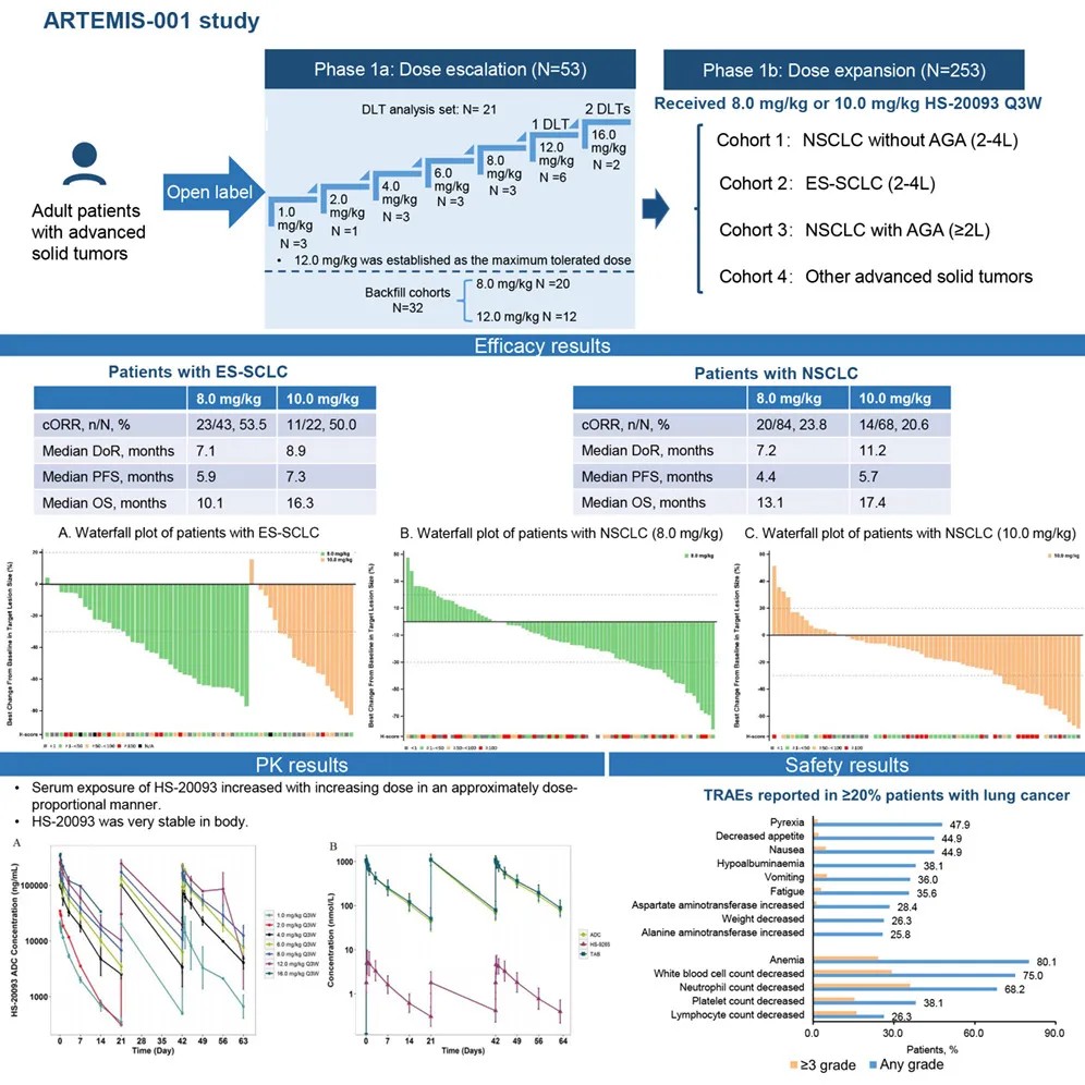 ARTEMIS-001研究共入组了306例既往接受过治疗的晚期实体瘤患者,其中包括259例肺癌患者。研究旨在评估HS-20093的安全性、药代动力学和初步疗效。