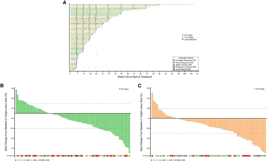 研究确定了12.0 mg/kg为最大耐受剂量。在236例接受8.0或10.0 mg/kg治疗的肺癌患者中,最常见的≥3级治疗相关不良事件为中性粒细胞计数减少、白细胞计数减少和贫血,发生率在8.0 mg/kg剂量组显著低于10.0 mg/kg剂量组。治疗相关间质性肺疾病发生率为3.4%,大多数经糖皮质激素治疗后恢复或正在恢复。总体而言,8.0 mg/kg剂量组显示出更好的安全性,因不良事件导致的剂量中断、降低和停药比例均更低。基于综合获益风险评估,8.0 mg/kg被选定为后续三期临床试验的推荐剂量。