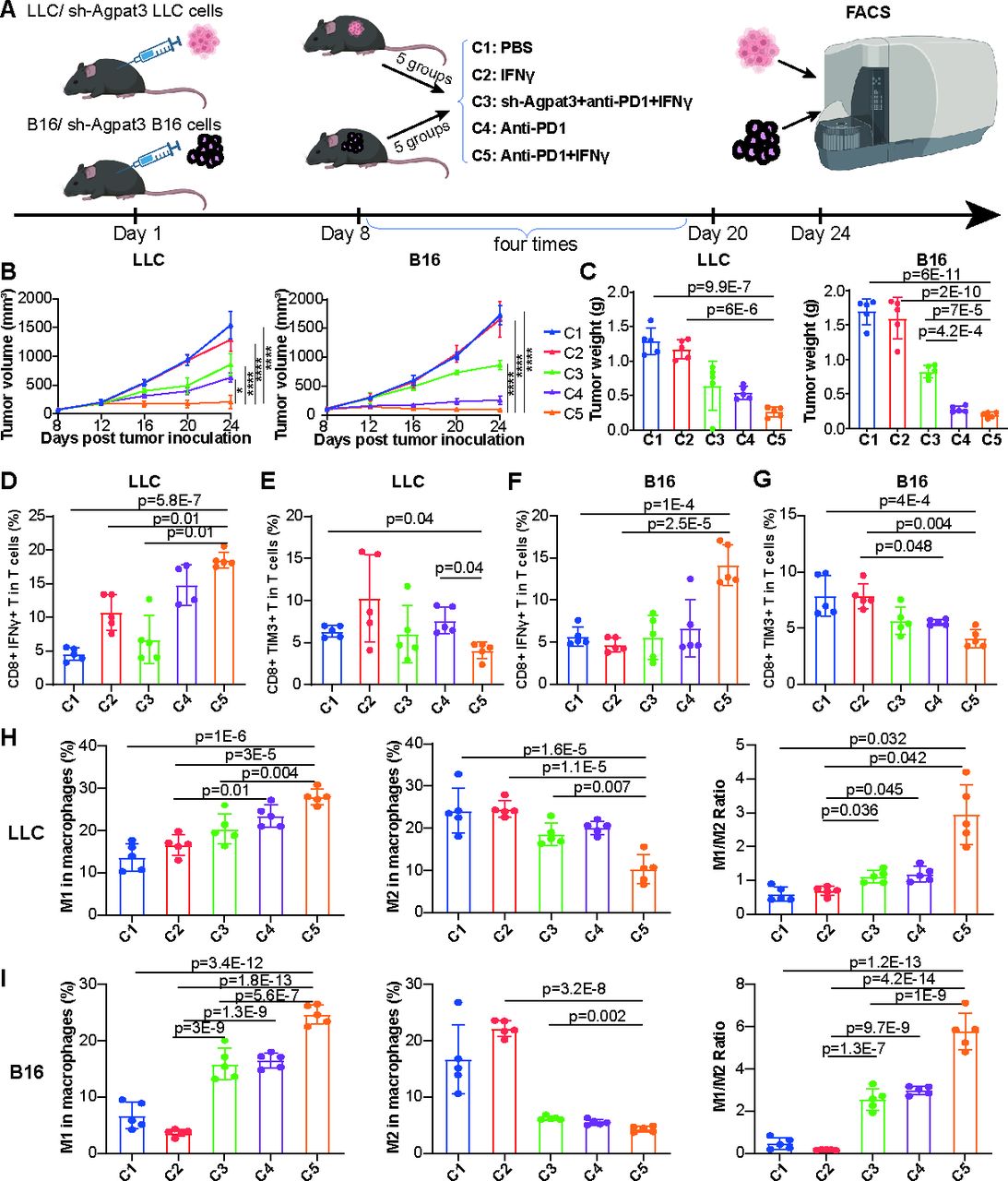 为了确定 AGPAT3 在 IFN-γ 联合免疫检查点抑制剂(ICI)治疗中的作用,研究人员使用小鼠黑色素瘤和肺癌模型进行了体内实验。在肺癌和黑色素瘤模型中,单独使用抗 PD-1 治疗与对照组相比显著缩小了肿瘤大小,而单独使用 IFN-γ 则没有明显的抗肿瘤效果。然而,当与抗 PD-1 治疗联合使用时,IFN-γ 治疗具有显著的肿瘤抑制作用。但当敲低 Agpat3 时,这种增强作用并未观察到。对肿瘤浸润免疫细胞的流式细胞术分析显示,IFN-γ 与抗 PD-1 联合使用显著增加了 CD8+ IFN-γ+ T 细胞的比例,并减少了 CD8+ TIM3+ T 细胞的数量。这些结果表明,IFN-γ 增强了免疫激活,从而改善了治疗效果。此外,我们还对比了巨噬细胞的变化。与 C1 组相比,C4 和 C5 组的 M1 巨噬细胞数量显著增多,而所有巨噬细胞群体中的 M2 巨噬细胞数量则减少。与单独使用 IFN-γ 或抗 PD-1 抗体治疗相比,IFN-γ 与抗 PD-1 抗体的联合治疗在耗尽 M2 细胞群方面表现出协同效应。因此,C4 组的 M1/M2 比值最高。然而,在 sh-Agpat3 组(C3)中未观察到这些变化,这表明 IFN-γ 通过 Agpat3 介导的途径增强抗肿瘤免疫反应和免疫检查点抑制剂(ICI)的疗效。因此,只要存在 AGPAT3,IFN-γ 和 PD-1 阻断可能通过将巨噬细胞极化向 M1 表型转变并促进 T 细胞介导的抗肿瘤活性,从而协同重塑肿瘤浸润免疫微环境(TIME)。研究表明观察到的联合治疗的抗肿瘤效果不受单一给药顺序的限制。
