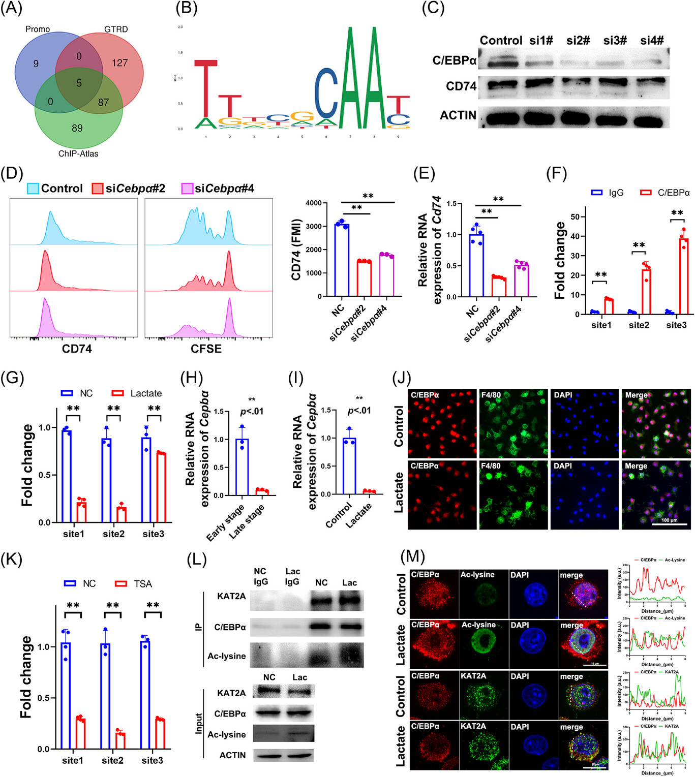 然后研究人员评估了肿瘤环境中乳酸的影响。研究人员发现乳酸处理显著削弱了 C/EBPα 与 Cd74 启动子的结合,这表明乳酸通过抑制 C/EBPα 的活性来干扰 Cd74 的转录。此外,在晚期肿瘤的肿瘤相关巨噬细胞(TAMs)以及经乳酸刺激后,C/ebpα 的表达也有所降低。