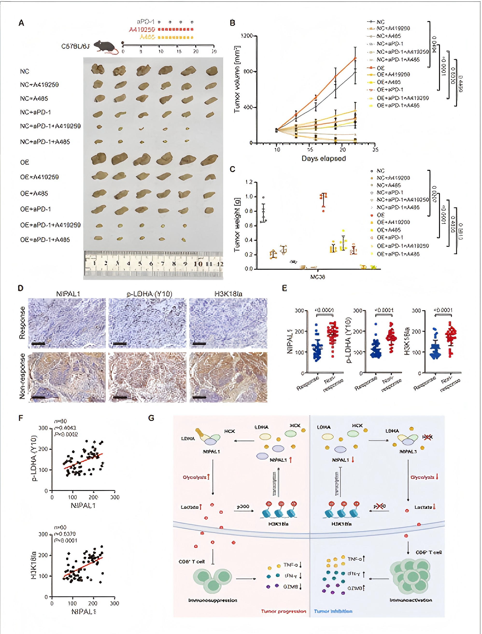 鉴于乳酸在维持 T 细胞耗竭中的关键作用,靶向乳酸代谢的治疗策略,如乳酸脱氢酶 A 抑制剂或单羧酸转运蛋白 4 抑制剂,可能通过重编程功能失调的 T 细胞并恢复其抗肿瘤活性与免疫检查点抑制剂(ICIs)产生协同作用。鉴于早期的研究发现 NIPAL1-HCK-H3K18la 环路可调节乳酸分泌,研究人员接下来研究了破坏这一调节回路是否能改善免疫治疗效果。事实上,与单药治疗或对照治疗相比,用 HCK 抑制剂或 p300 抑制剂联合抗 PD-1 抗体治疗携带 NIPAL1 过表达 MC38 肿瘤的小鼠,显著抑制了肿瘤生长。