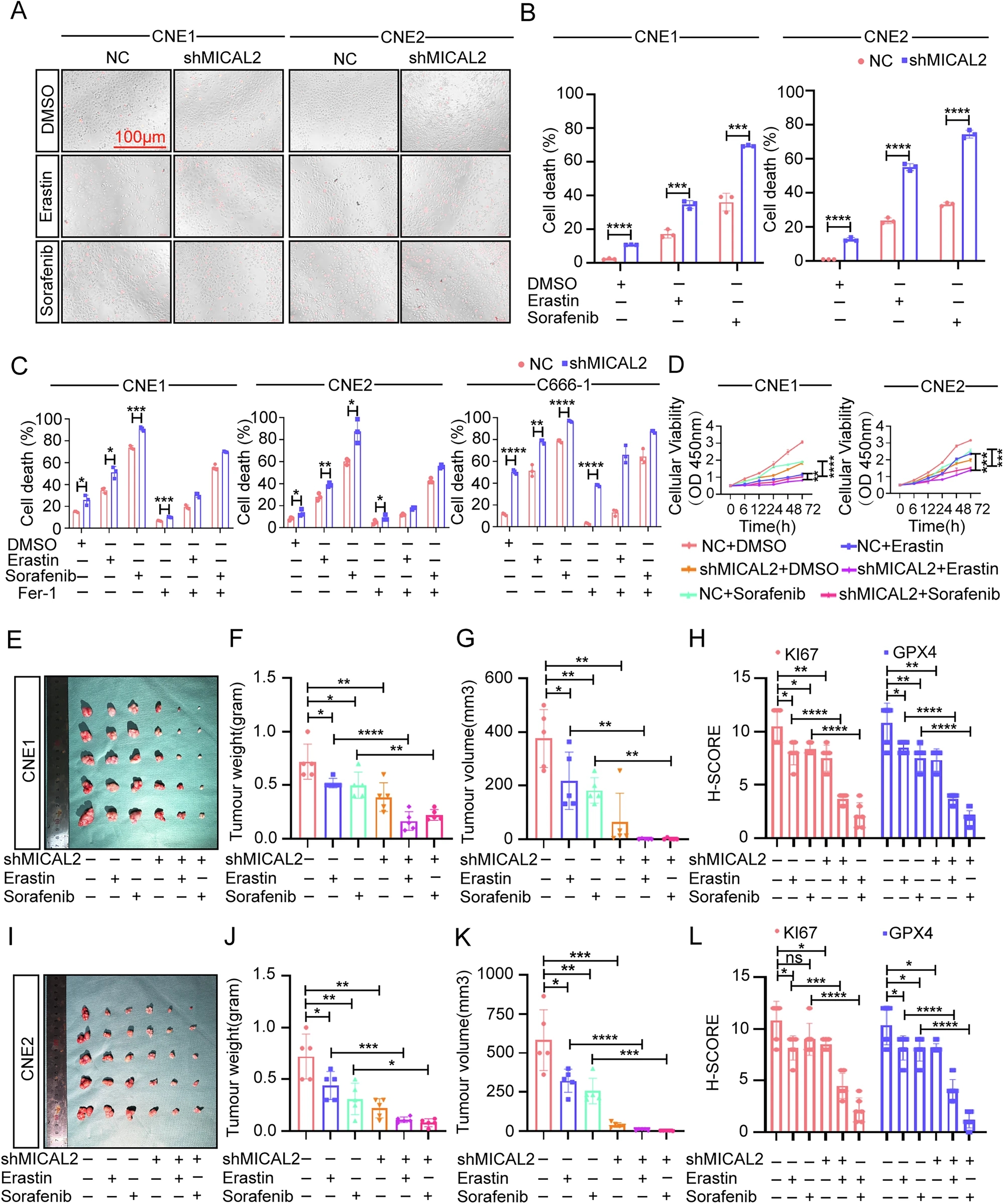 研究结果表明,MICAL2 敲低后 PI 阳性细胞的比例增加,且 MICAL2 敲低增强了爱拉斯汀和索拉非尼诱导的 PI+死细胞。此外, 染色实验和 CCK8 实验表明,缺乏 MICAL2 的鼻咽癌细胞对爱拉斯汀和索拉非尼等铁死亡诱导剂更敏感,导致细胞死亡率增加。此外,染色实验还证实,这种效应可通过应用铁死亡抑制剂逆转。基于体外增殖实验结果,研究人员将不同表达水平的 MICAL2 细胞皮下接种到裸鼠体内。研究人员用爱拉斯汀或索拉非尼处理小鼠直至实验结束。铁死亡诱导剂进一步抑制了肿瘤的生成。另外,诱导剂与 shMICAL2 的联合治疗显著缩小了肿瘤的大小,表明体内 MICAL2 的低表达增强了对铁死亡诱导剂的敏感性。而且,对异种移植瘤进行的免疫组化检测显示,MICAL2 表达水平较低的肿瘤,其增殖标志物 Ki67 和铁死亡指标(如 GPX4)的水平也较低。通过这些体内和体外实验,研究人员证明了敲低 MICAL2 可以提高铁死亡诱导剂爱拉斯汀和索拉非尼的敏感性,从而抑制鼻咽癌的进展。