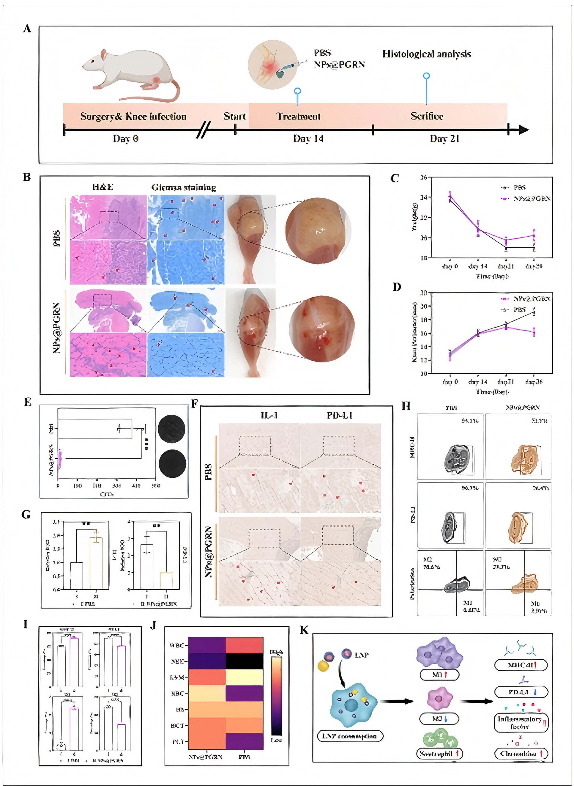 为了评估 NPs@PGRN 在体内的治疗效果,研究人员将纳米颗粒应用于慢性膝关节感染的小鼠模型。小鼠在第 0 天接受关节内低剂量细菌接种,从第 14 天开始接受 NPs@PGRN 治疗。治疗 2 周后,小鼠被安乐死以进行终点分析。