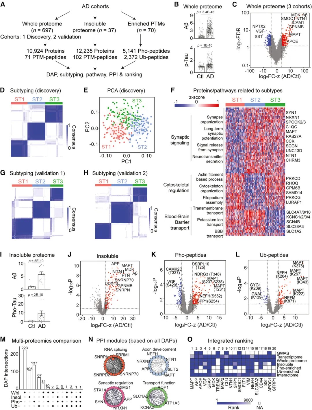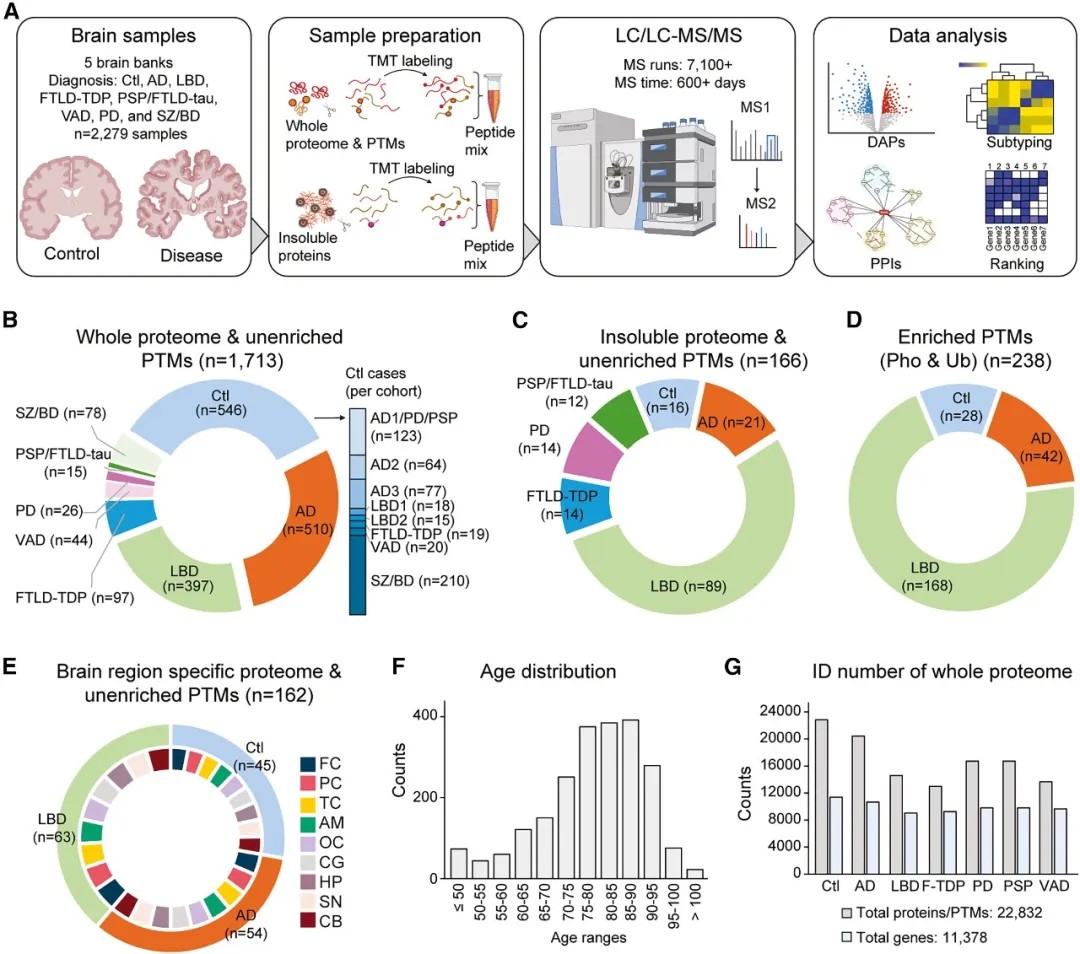 研究团队采用了一种先进的多层蛋白质组学策略,对2279例死后人脑样本(包括阿尔茨海默病、路易体痴呆、伴有TDP-43病理的额颞叶变性、伴有tau病理的进行性核上性麻痹、血管性痴呆及帕金森病)进行了系统分析。分析涵盖了全蛋白质组、不溶性蛋白质组(富集错误折叠和聚集蛋白)以及翻译后修饰。
