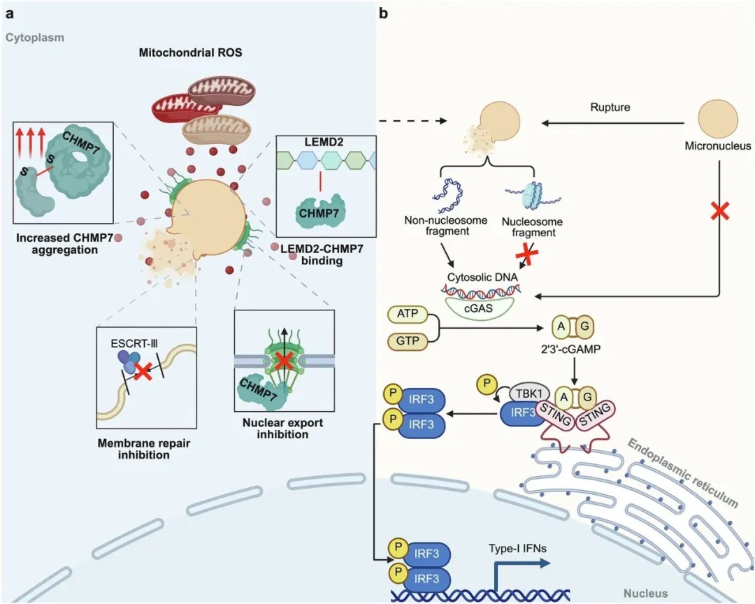 微核破裂释放的DNA被细胞质中的传感器cGAS识别,进而激活STING蛋白,最终诱发I型干扰素等免疫因子的产生。这原本是细胞抵抗异常DNA(如病毒入侵)的防御机制。但在肿瘤微环境中,这条通路的作用变得复杂而矛盾。