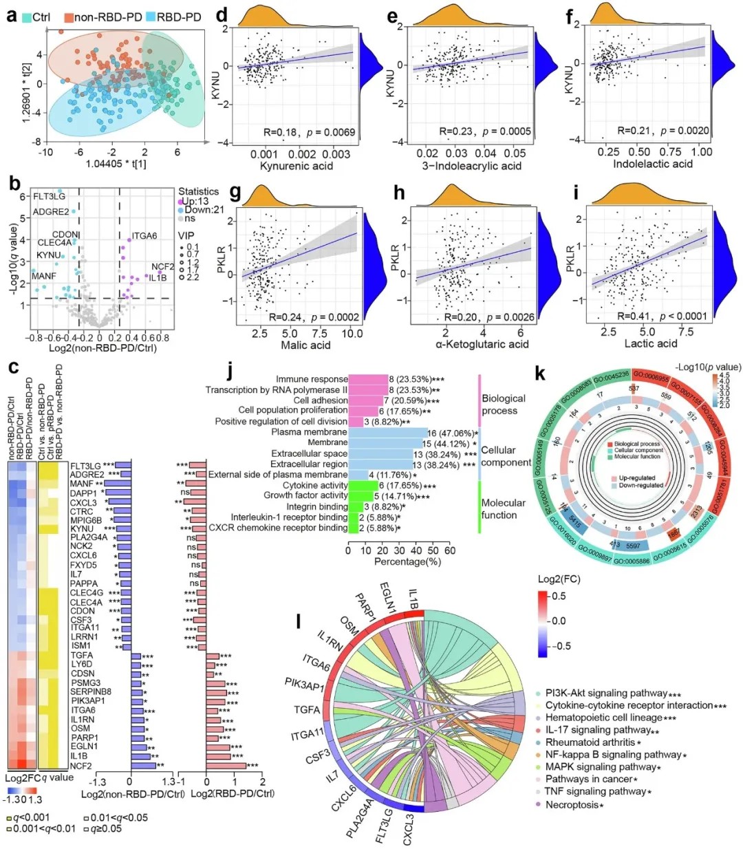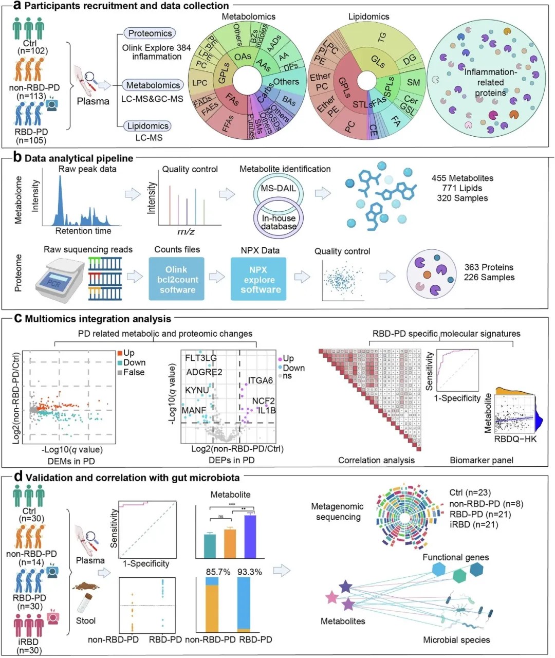 为了深入解析RBD-PD亚型独特的病理机制,研究团队对424名参与者(包括RBD-PD患者、不伴RBD的PD患者、特发性RBD患者及健康对照)的血浆样本进行了多层次、多平台的整合分析。
